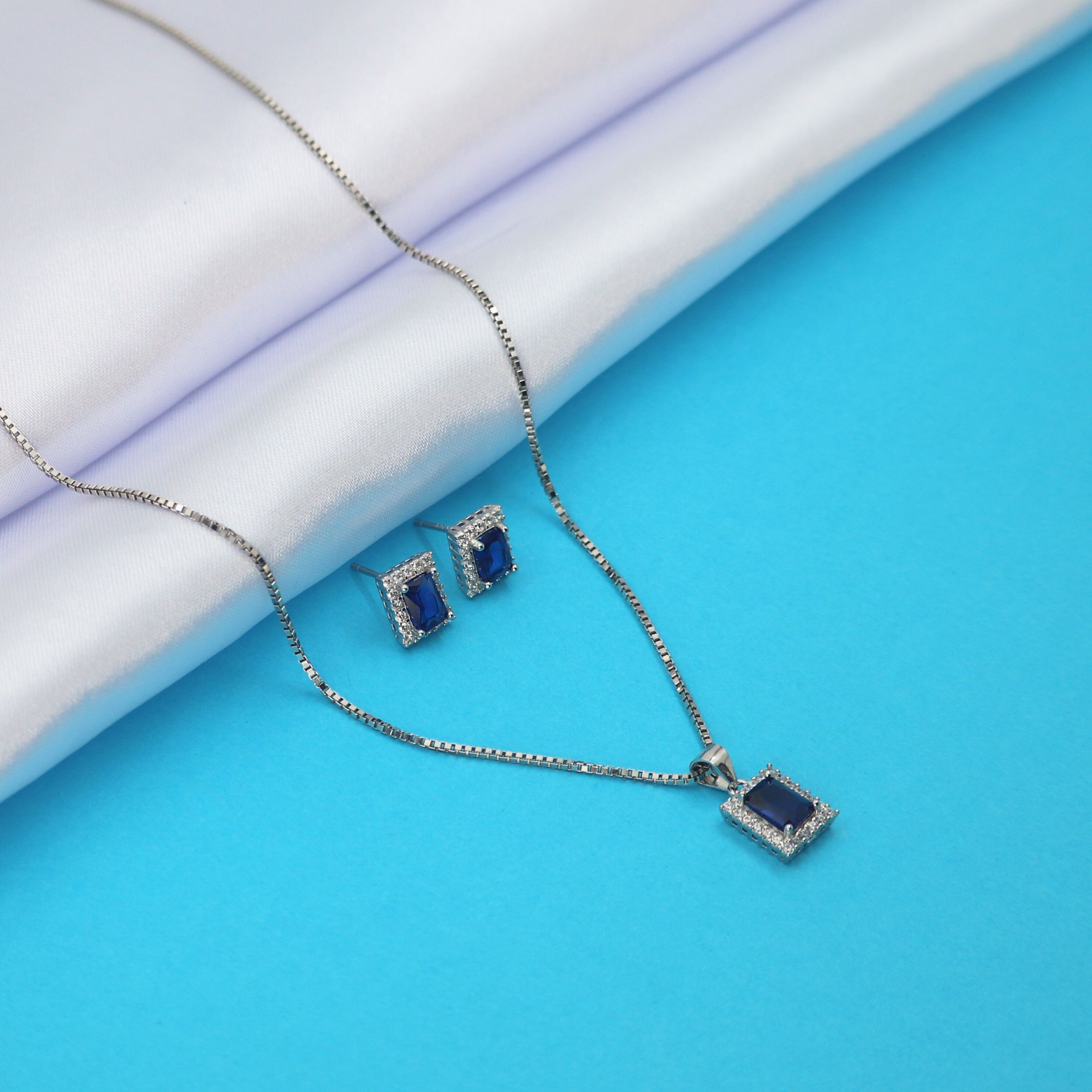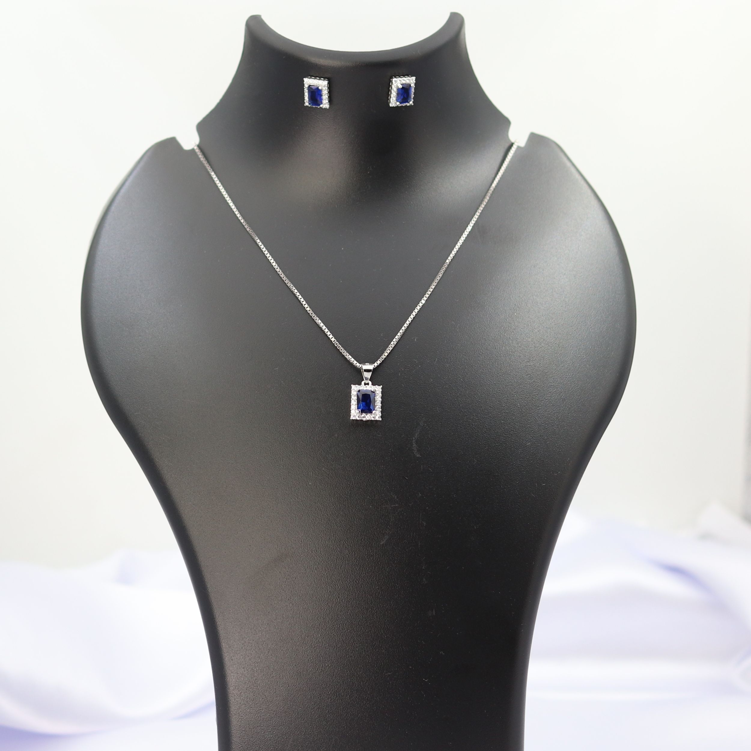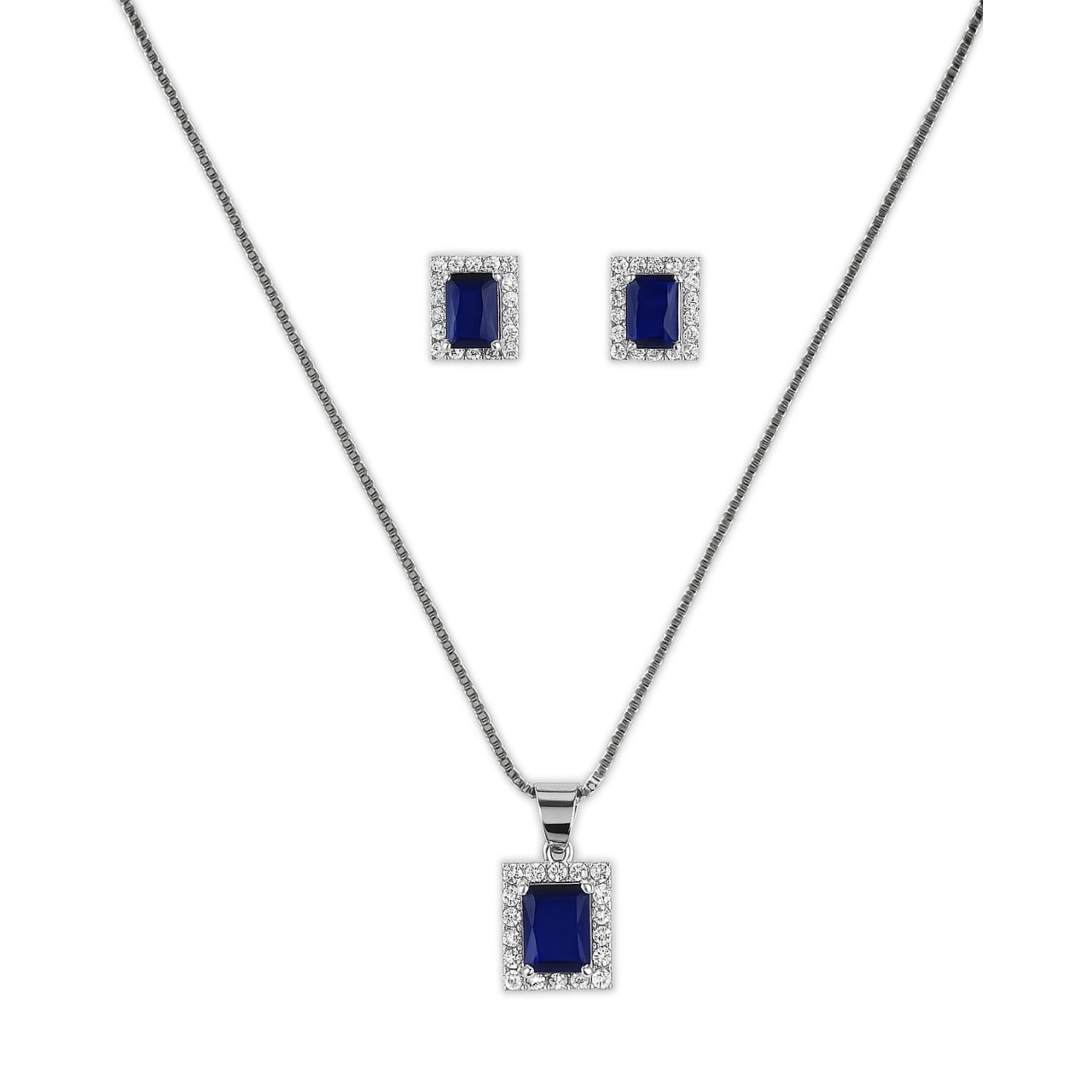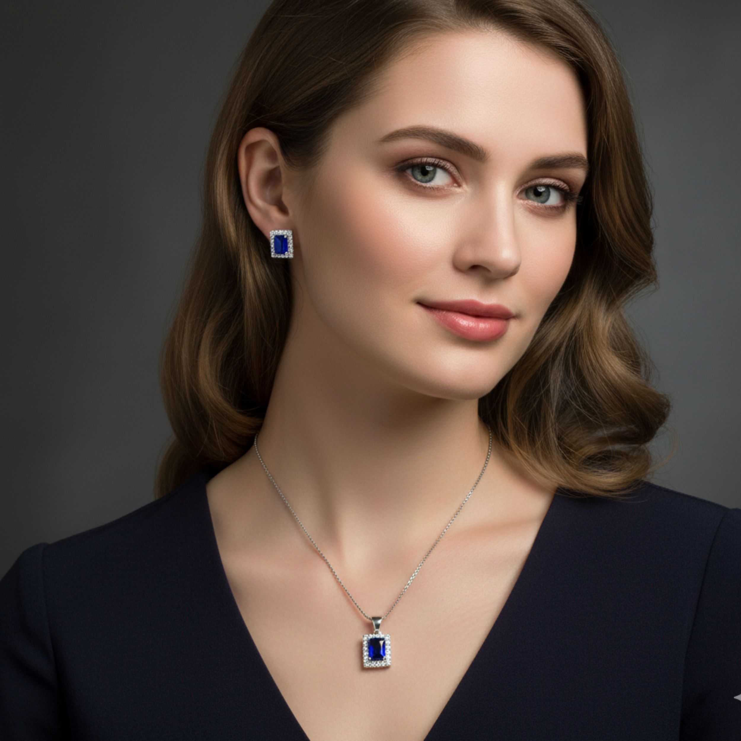 Elevate your jewellery collection with this stunning 925 Sterling Silver set featuring exquisite blue sapphire stones. The set includes a graceful pendant necklace and matching stud earrings, each showcasing rectangular-cut blue sapphires surrounded by sparkling crystal accents in an elegant halo design. The pendant comes with a sleek box chain that perfectly complements the sophisticated arrangement. The sterling silver construction ensures durability while maintaining a luxurious appearance. Perfect for both everyday wear and special occasions, this versatile jewellery set adds a touch of refinement to any ensemble. The deep blue hue of the sapphires creates a striking contrast against the brilliant crystals, making it an ideal choice for those who appreciate classic elegance with a modern twist. This set makes for a thoughtful gift choice, suitable for celebrating special moments or simply showing appreciation to someone special.