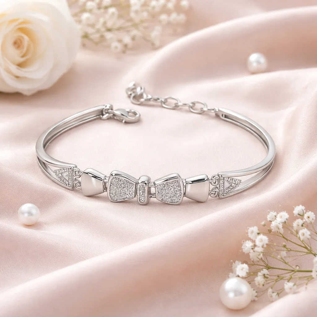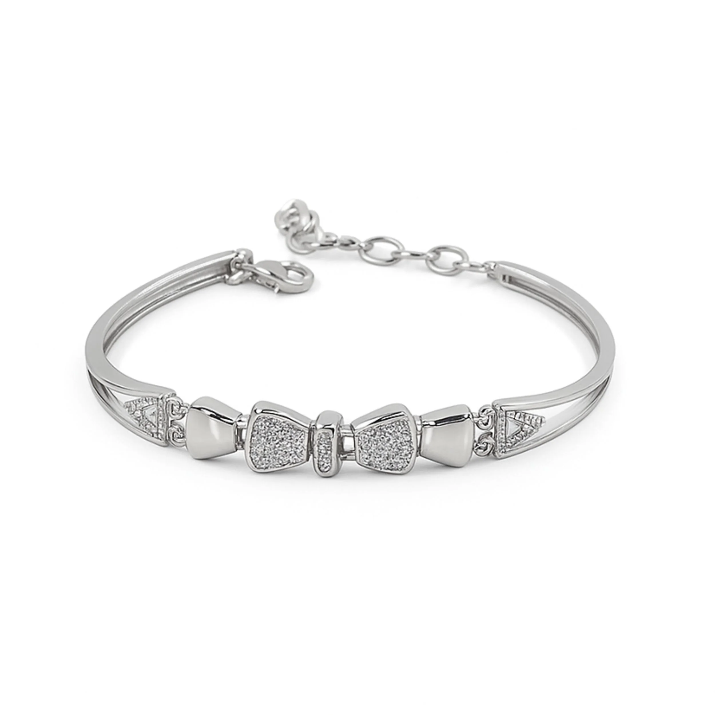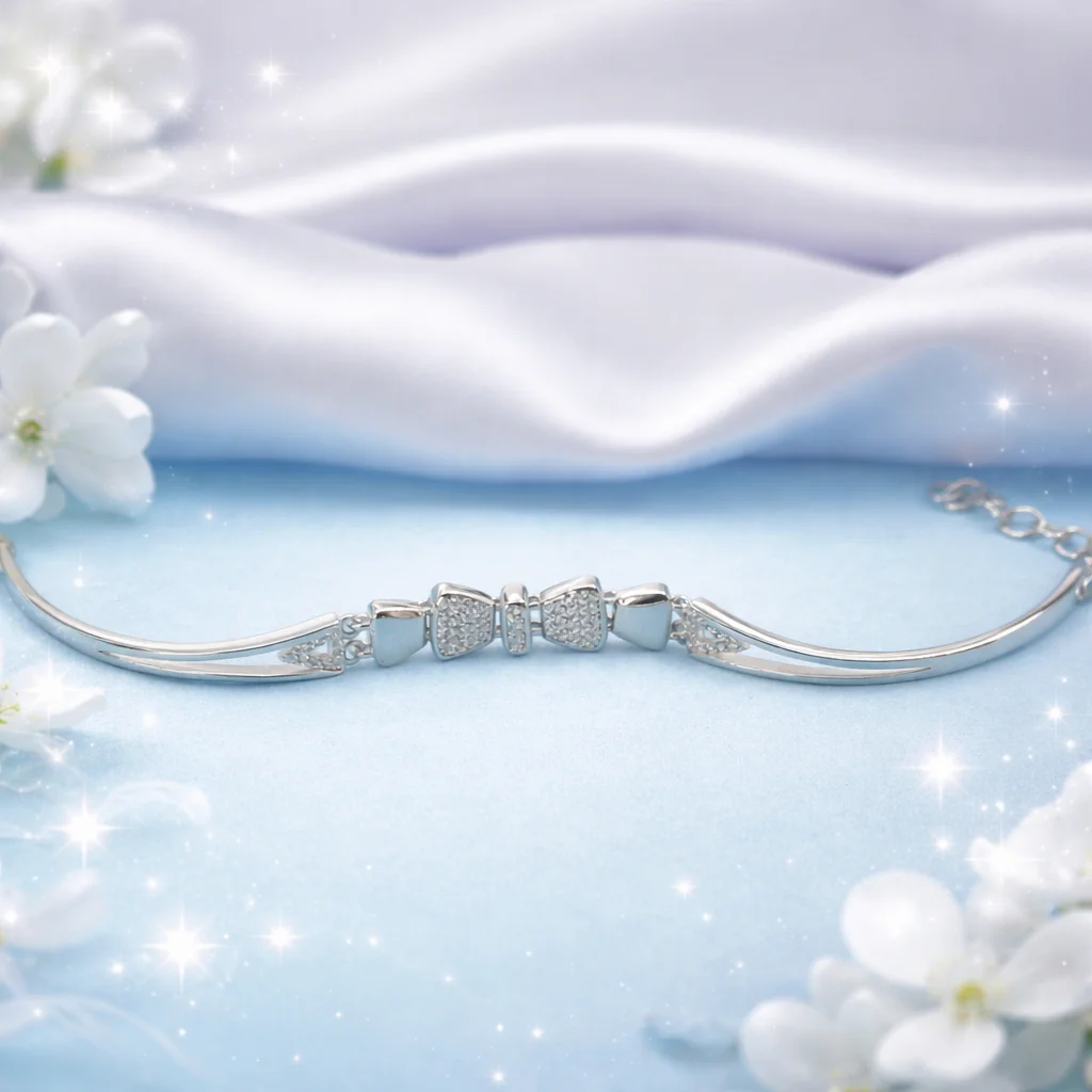 Add a touch of elegance to your jewellery collection with this exquisite 925 silver bracelet featuring a charming bow design. The delicate double-strand band gracefully holds a stunning crystallised bow centrepiece, complemented by subtle triangular accents on each side. The bracelet showcases intricate craftsmanship with its glittering crystal-studded elements that catch and reflect light beautifully. Crafted from genuine 925 sterling silver, this bracelet comes with an adjustable chain closure for a comfortable, secure fit. The sophisticated design makes it a perfect accessory for both casual and formal occasions. This versatile piece can be worn alone for a subtle statement or stacked with other bracelets for a more dramatic look. The bracelet arrives with a certificate of authenticity and bears the 925 stamp, assuring its sterling silver quality. Makes for a thoughtful gift choice that will be treasured for years to come.
