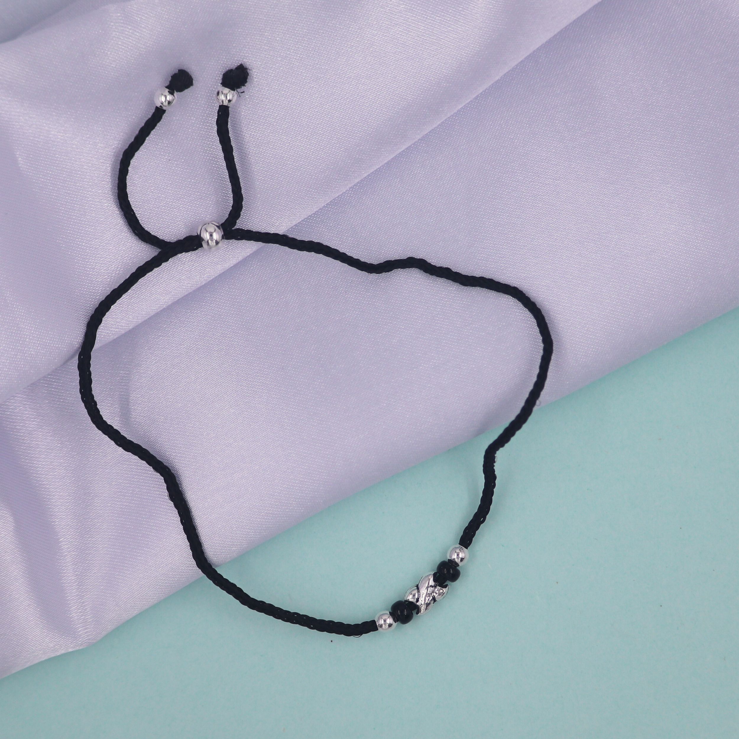 Add a touch of elegance to your traditional attire with this exquisite 925 silver Nazariya thread anklet. Crafted with precision, this single anklet features beautiful silver beads and an intricate design element that adds a subtle sparkle to your feet. The black adjustable thread ensures a comfortable, customised fit for all sizes. The delicate combination of silver beads with the durable black thread creates a perfect balance between traditional charm and contemporary style. Each piece comes with a 925 stamp, assuring authentic silver quality. This versatile anklet can complement both casual and festive outfits, making it an ideal accessory for various occasions. Perfect as a thoughtful gift for someone special, this anklet beautifully combines traditional craftsmanship with modern aesthetics. The adjustable sliding closure mechanism allows for easy wearing and secure fit.
