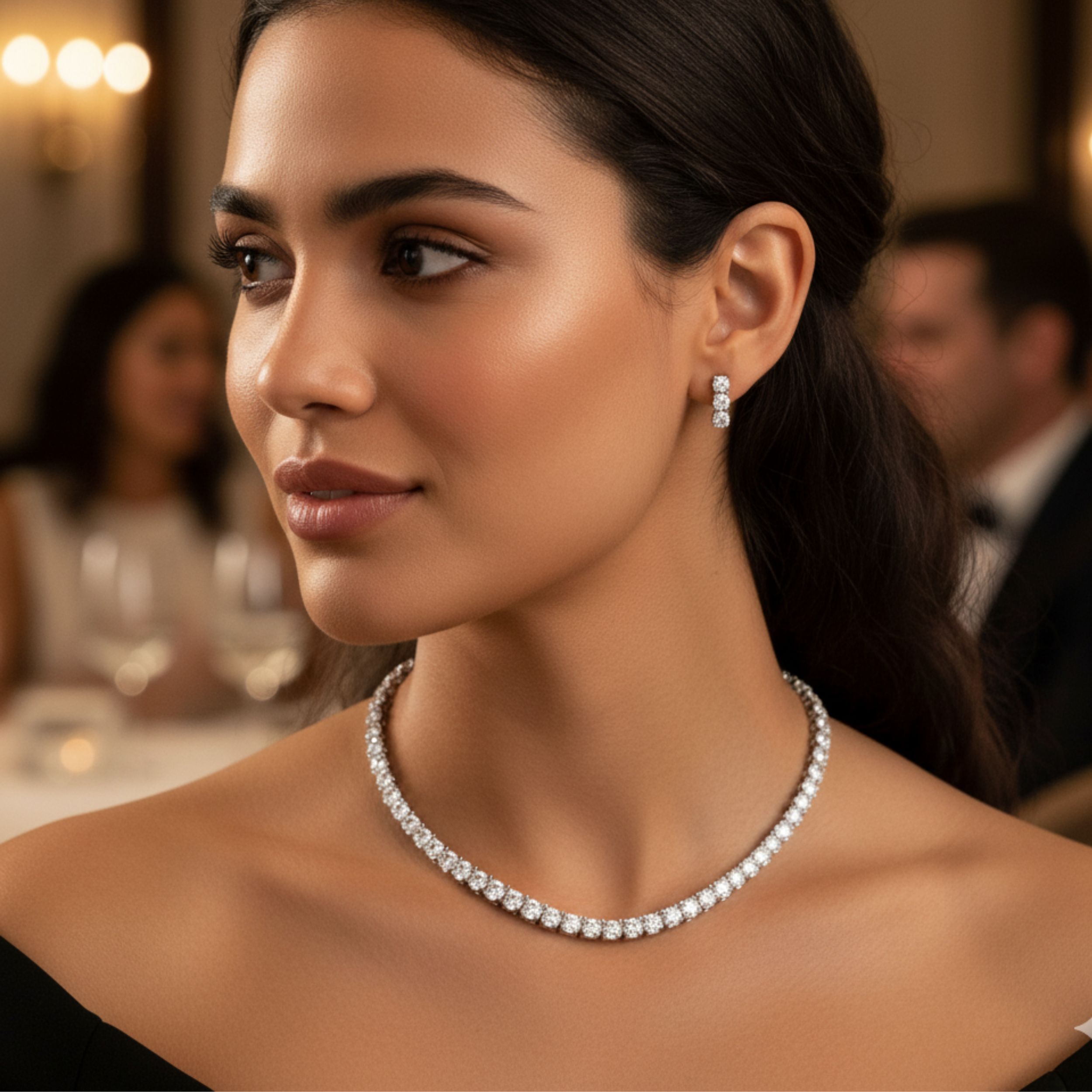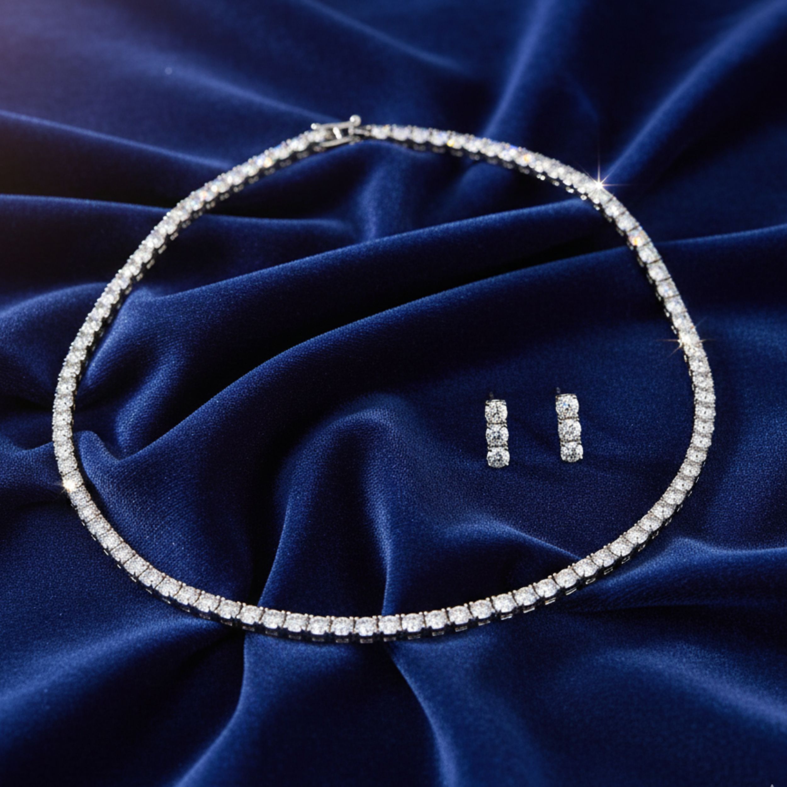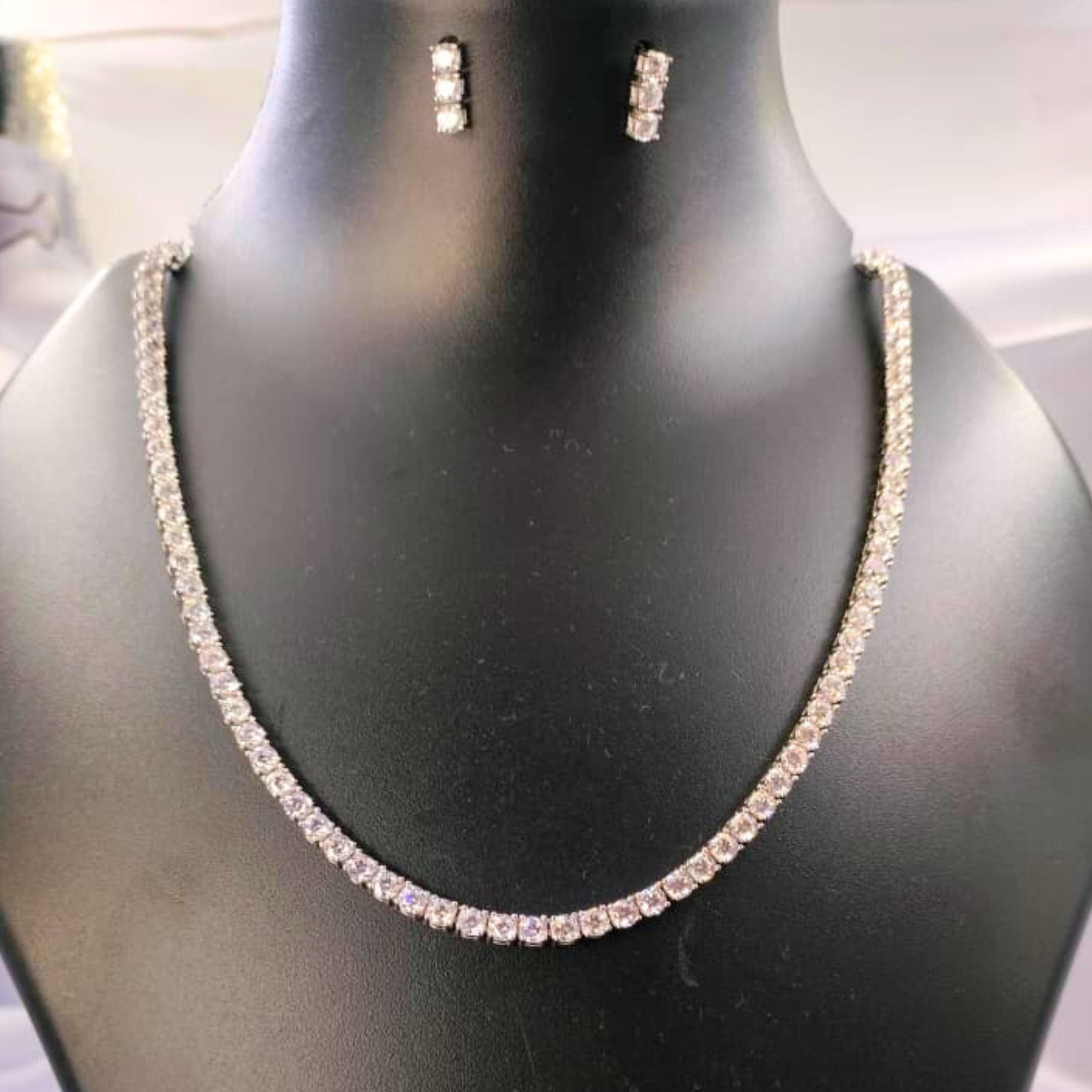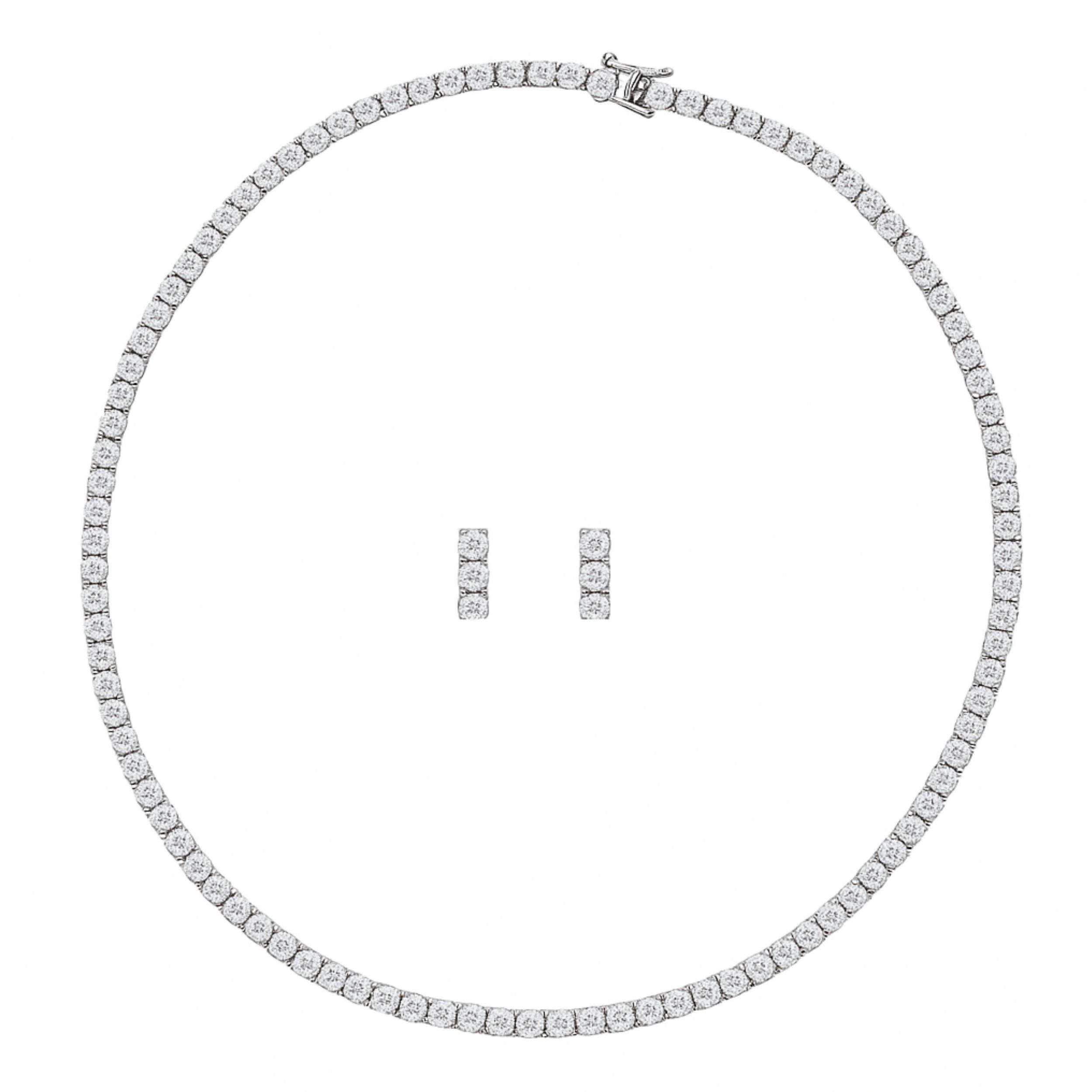 Elevate your jewellery collection with this exquisite sterling silver tennis necklace and earring set. Crafted from premium 925 sterling silver, this classic ensemble features a stunning array of sparkling stones set in a sophisticated linear design. The necklace showcases a seamless arrangement of brilliant stones that catch and reflect light with every movement, creating a mesmerising display of sparkle. The matching drop earrings perfectly complement the necklace, completing this sophisticated set. The versatile design makes it suitable for both everyday wear and special occasions, adding a touch of elegance to any outfit. This timeless jewellery set makes for a perfect gift choice, ideal for expressing your affection to someone special. The premium sterling silver construction ensures lasting durability and maintains its lustrous finish. The set arrives beautifully packaged, ready to be treasured or gifted. Note: Handle with care and store in a cool, dry place to maintain its brilliance.