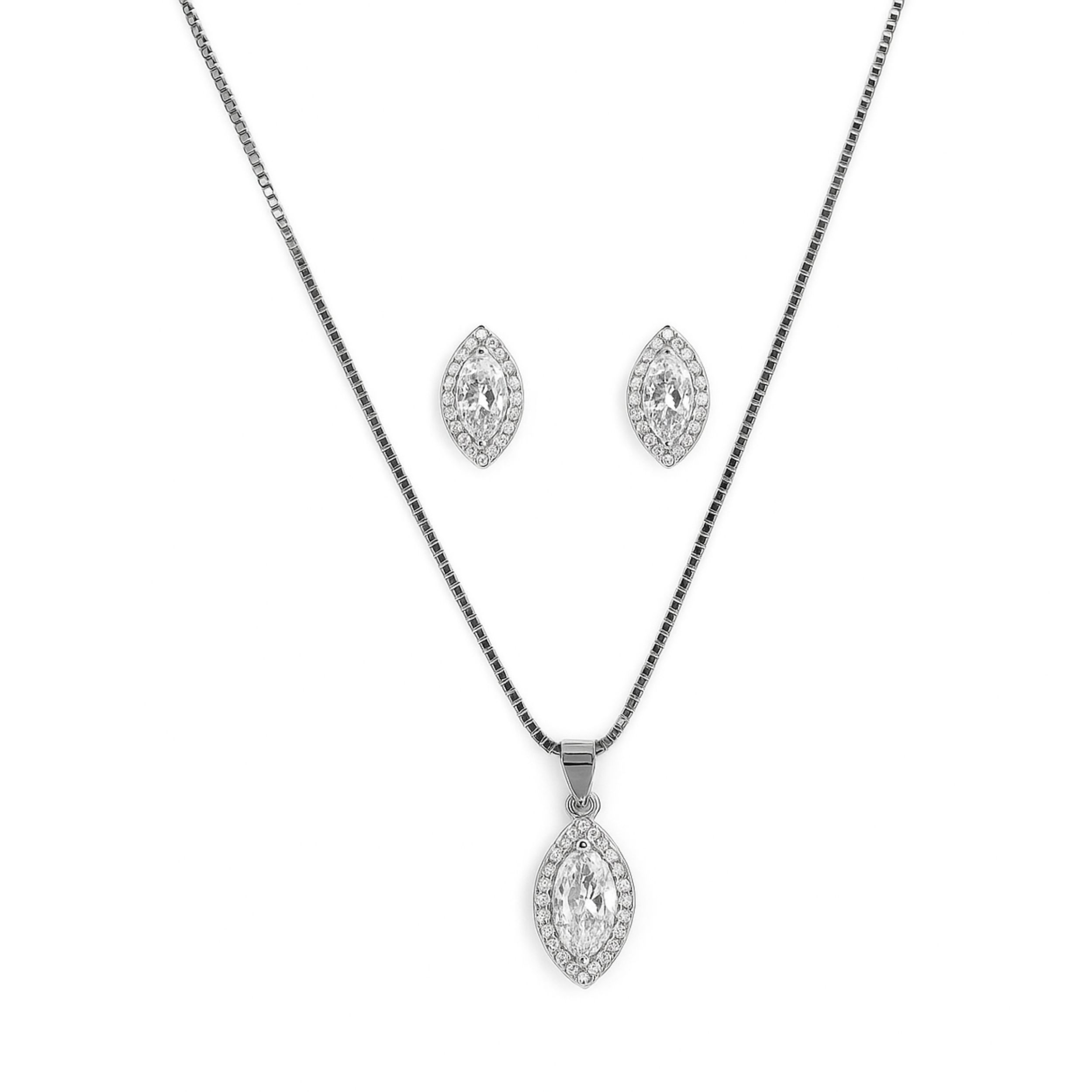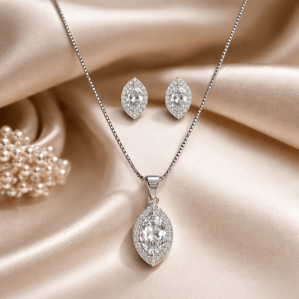 Crystal Marquise Silver Jewellery Set by Arika JewellersAdd a touch of elegance and sparkle to your jewellery collection with this beautifully designed silver jewellery set. Featuring a stunning marquise-shaped crystal centerpiece surrounded by delicate shimmering stones, this design captures light from every angle, creating a graceful and luxurious look. Additionally, the refined shape enhances its brilliance and uniqueness. As a result, it becomes a perfect choice for women who love elegant and eye-catching jewellery. Moreover, the sparkling stones add a radiant charm that elevates any outfit effortlessly. Why Choose This Crystal Marquise Silver Jewellery Set?Crafted with precision using premium 925 silver, this set features a sleek chain with an elegant pendant that perfectly complements the matching stud earrings. Therefore, it offers a complete and coordinated jewellery look. Whether you are attending weddings, parties, festive occasions, or special celebrations, this piece adds sophistication and charm. Furthermore, its lightweight design ensures all-day comfort without compromising on style.