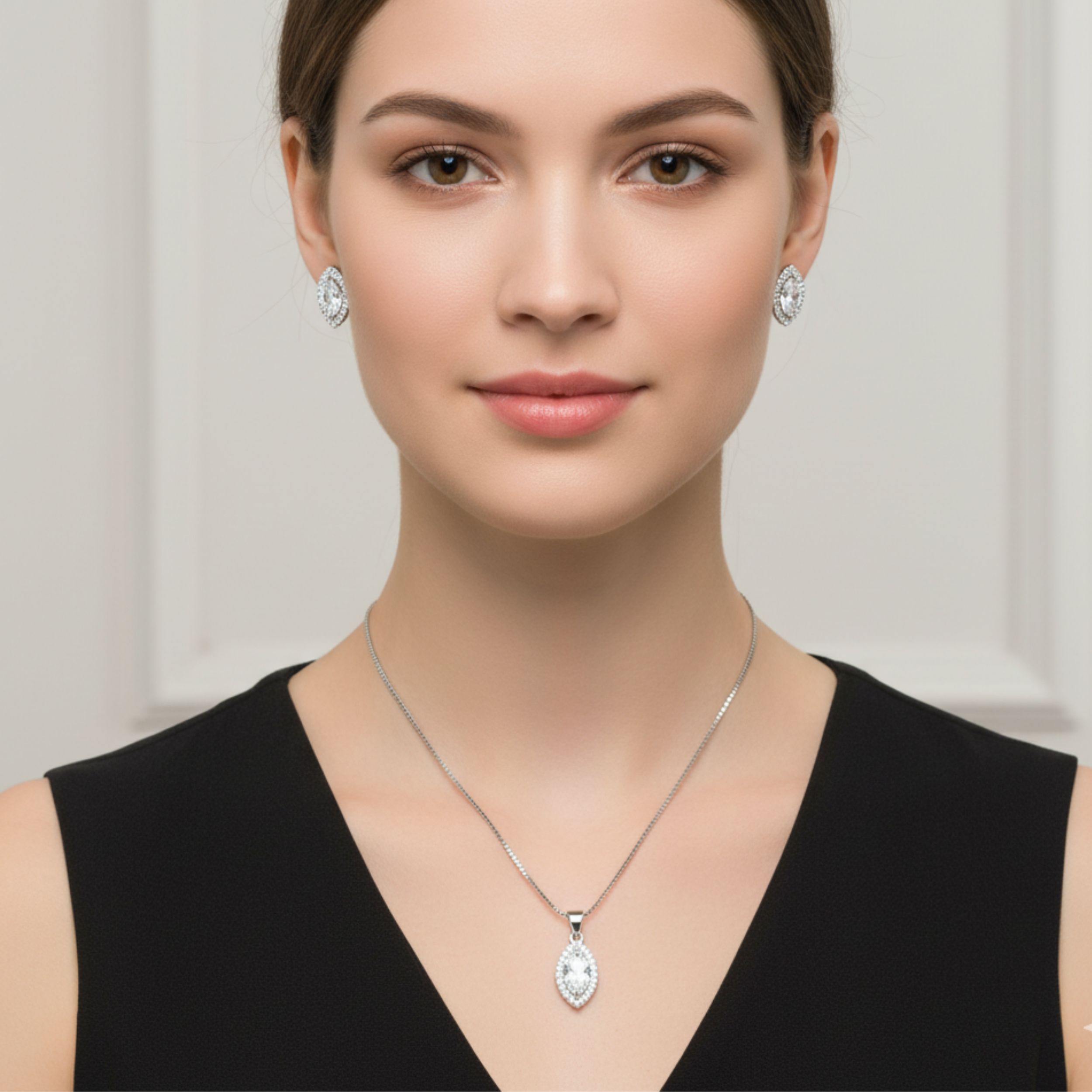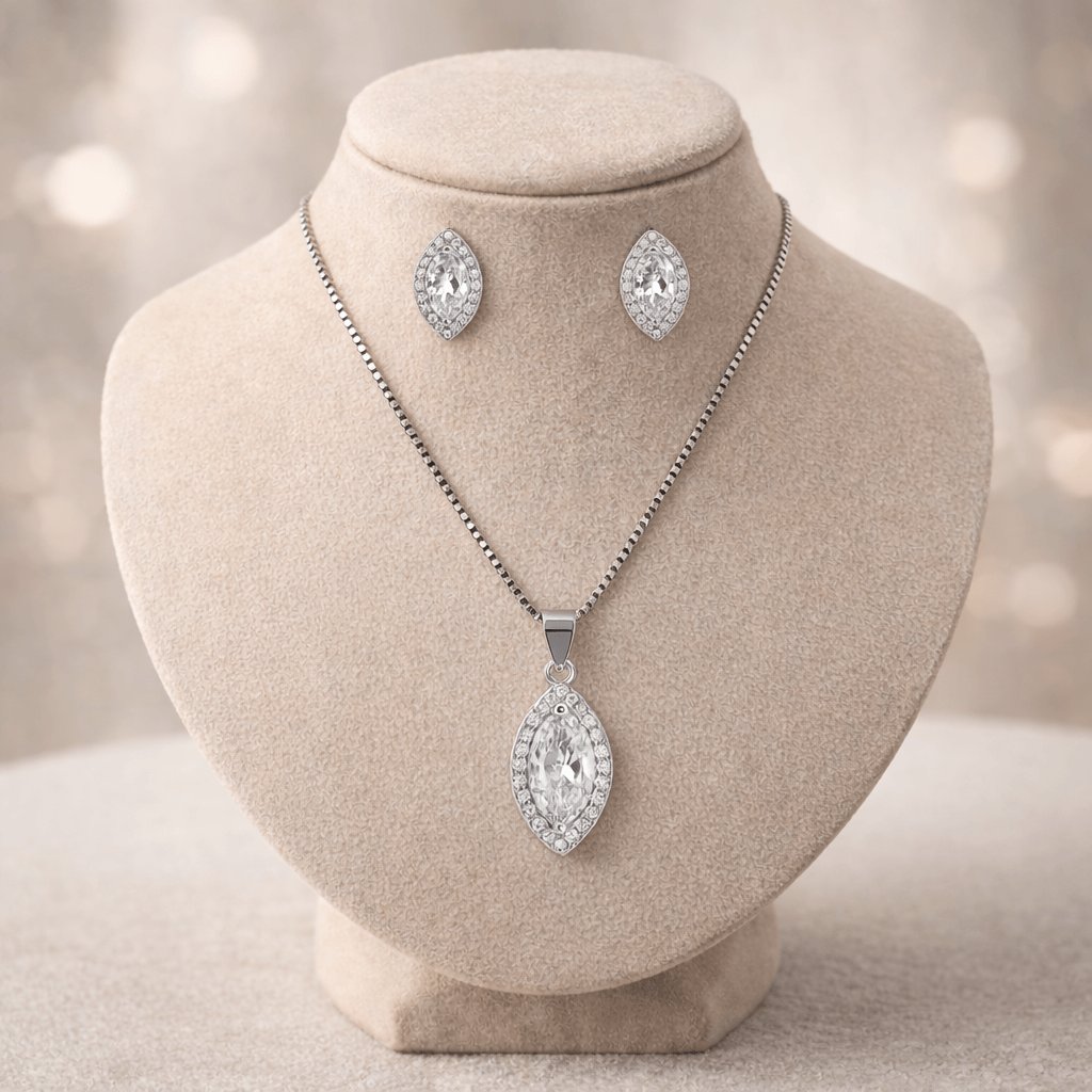Add timeless elegance to your look with the Crystal Marquise Silver Jewellery Set by Arika Jewellers. Featuring a stunning marquise-cut crystal pendant with matching earrings, this elegant jewellery set is perfect for weddings, parties, and special occasions.