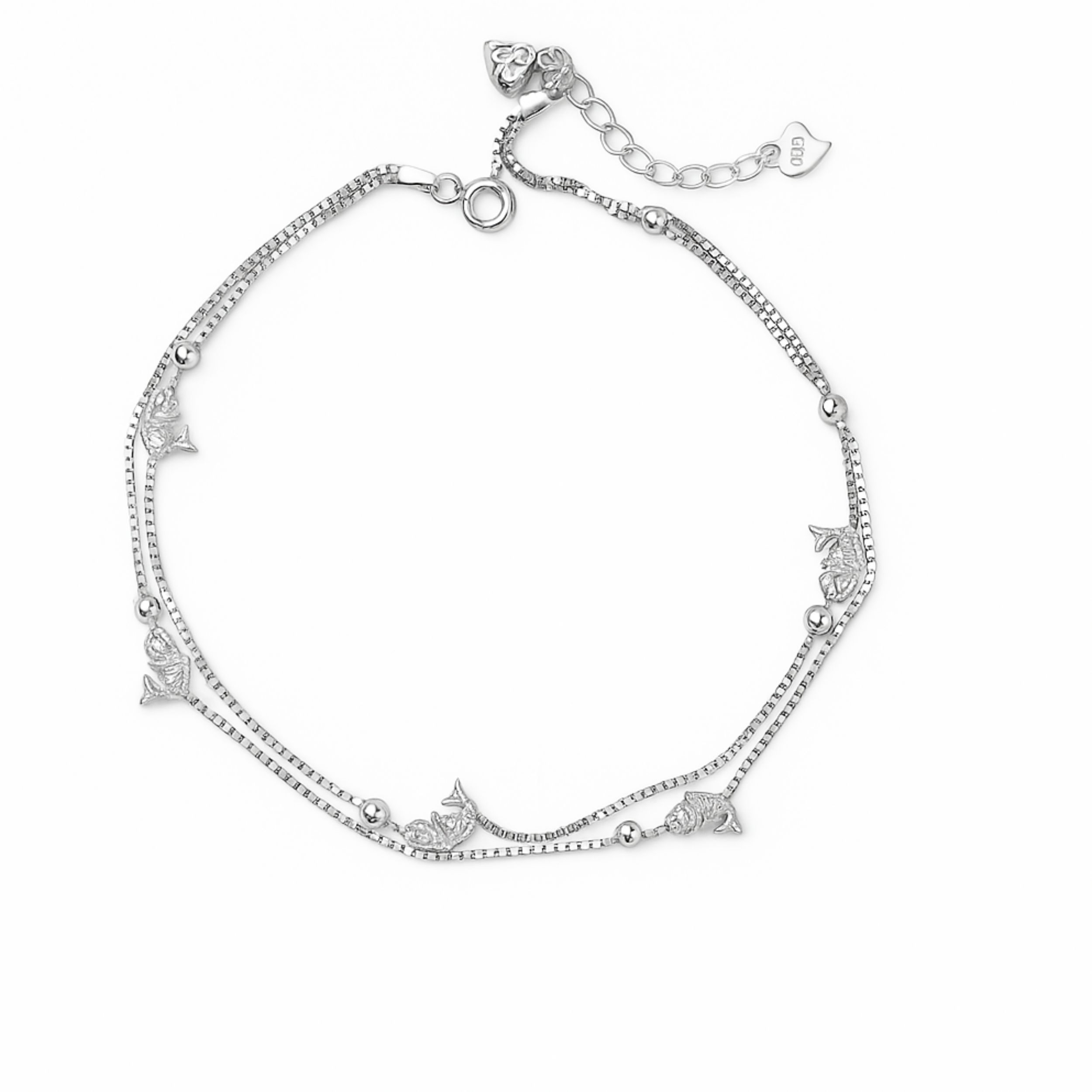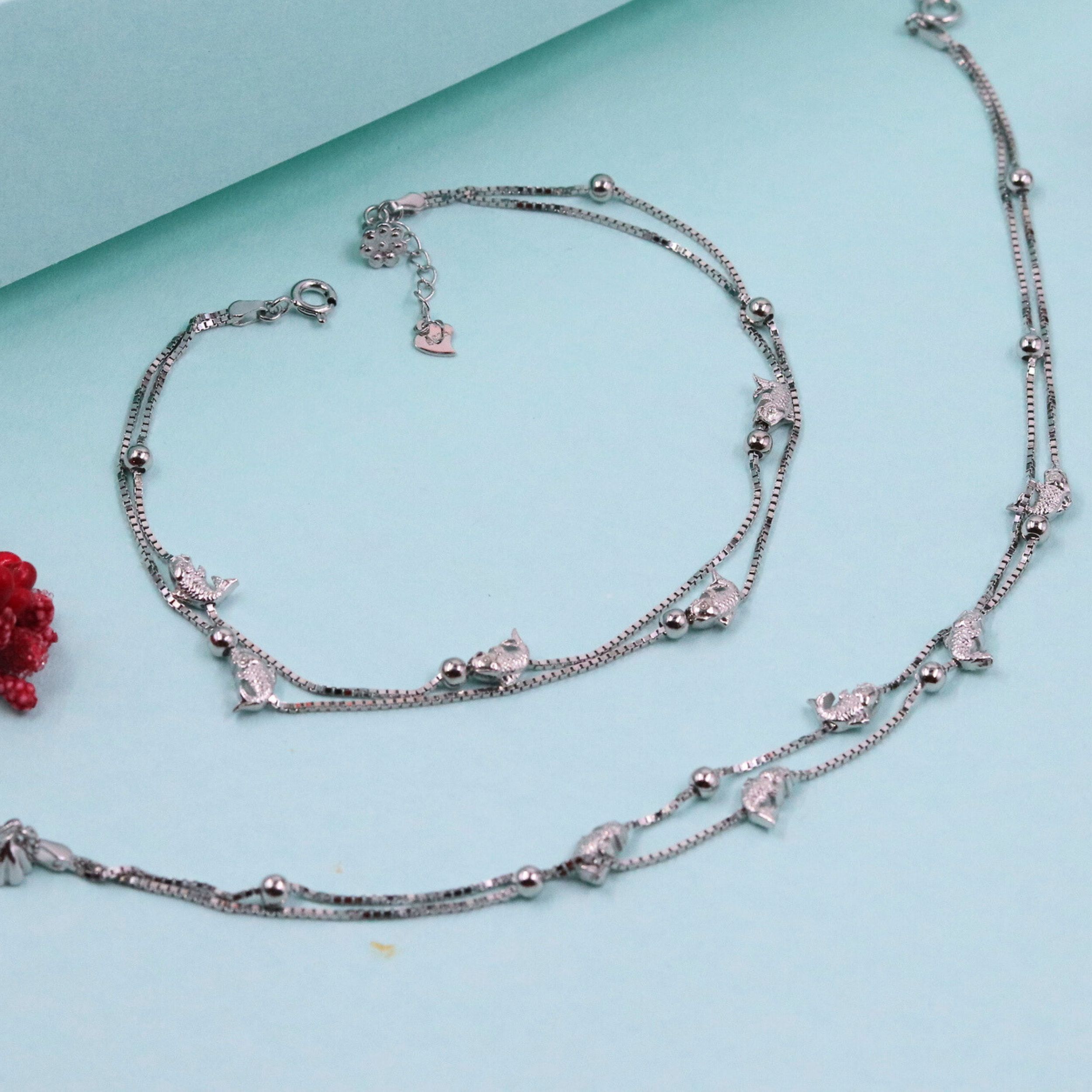 Dual-Layer Silver Anklet with Fish Charms