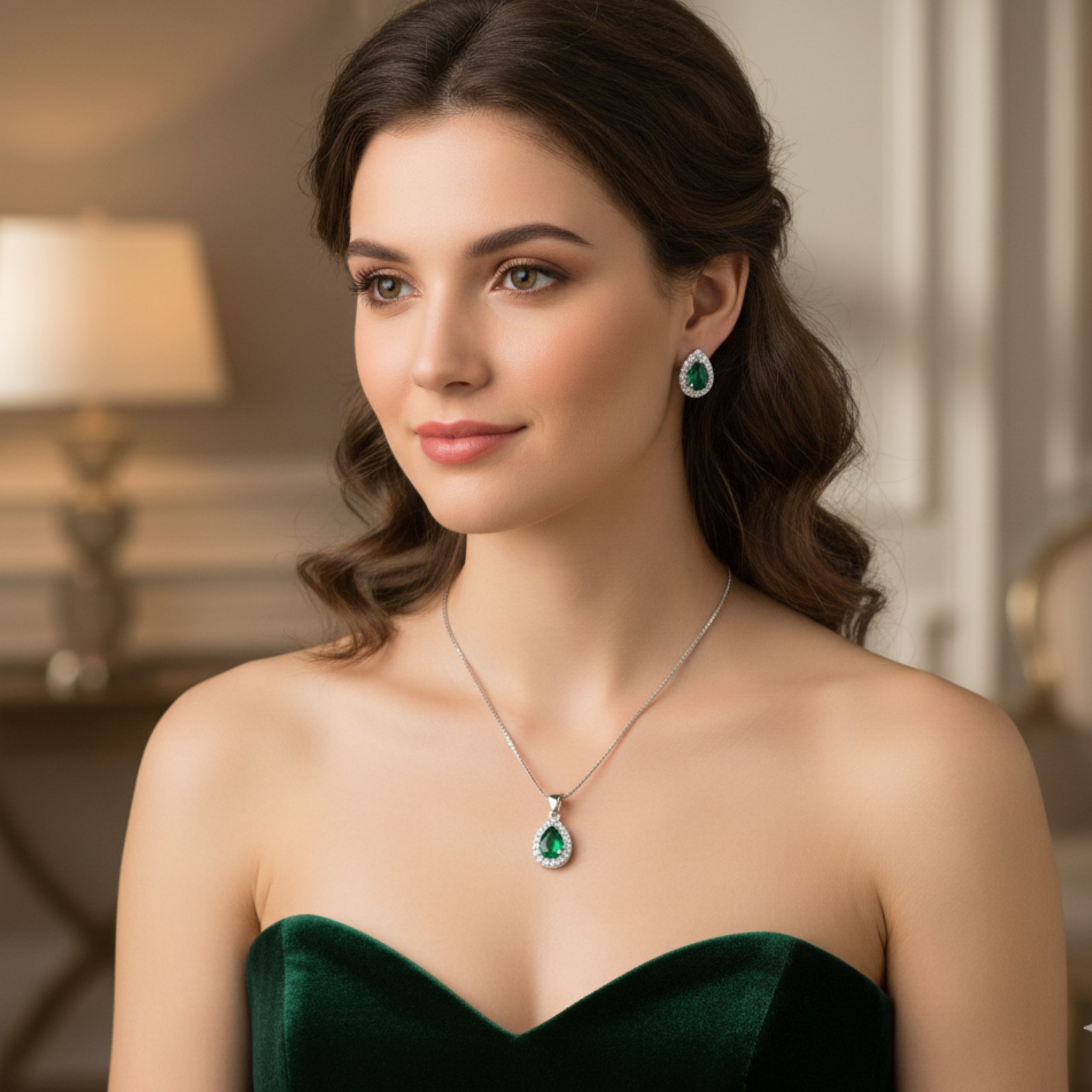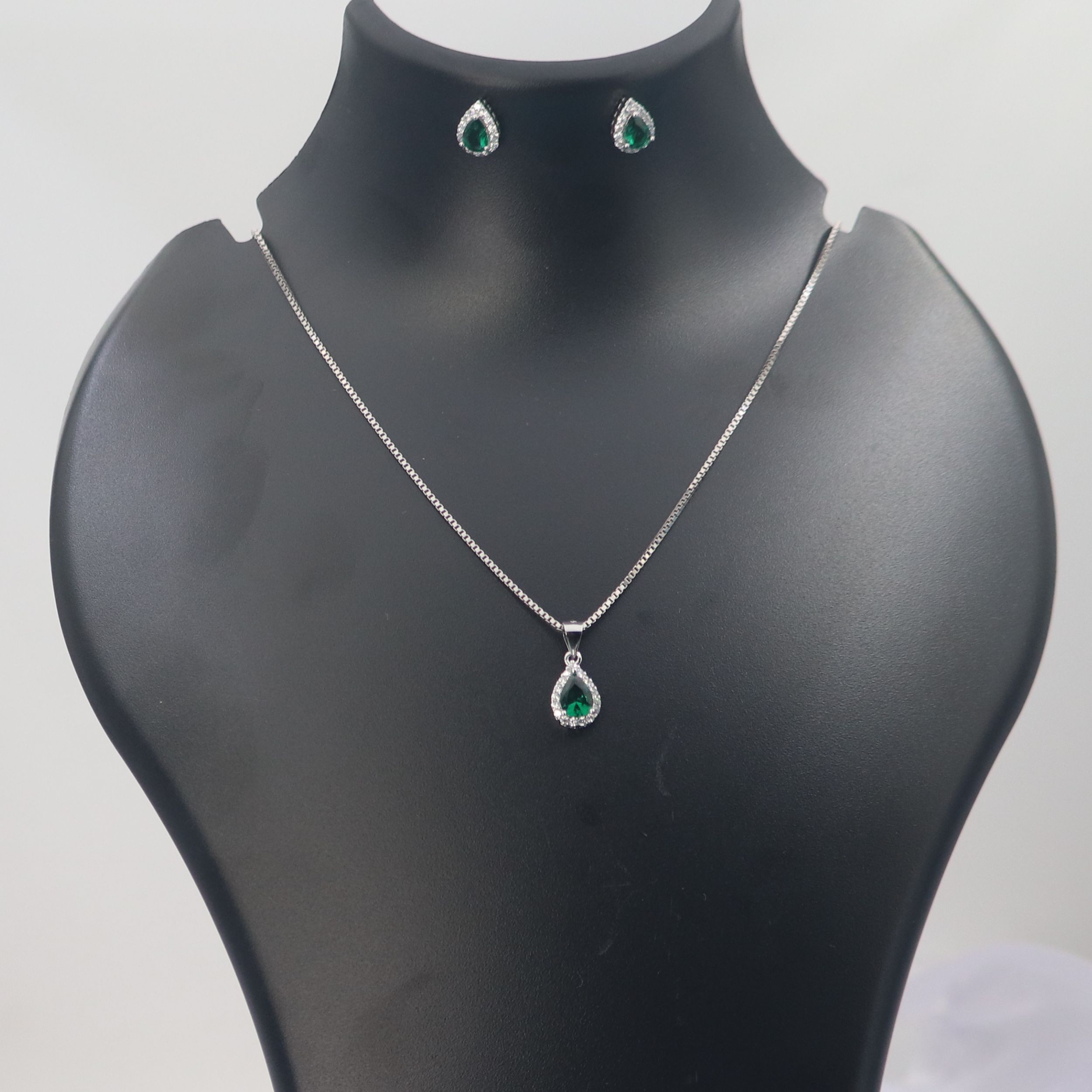 Elevate your jewellery collection with this exquisite 925 silver jewellery set featuring stunning emerald stones and sparkling diamonds. The set includes a graceful teardrop pendant necklace and matching stud earrings, each showcasing a brilliant green emerald surrounded by a halo of shimmering diamonds. The pendant comes with a sleek box chain that perfectly complements the sophisticated design. The teardrop setting enhances the natural beauty of the stones while providing secure placement. This versatile set transitions seamlessly from day to evening wear, making it perfect for both special occasions and everyday elegance. The sterling silver construction ensures durability and lasting lustre. An ideal choice for those who appreciate timeless jewellery with a touch of colour, this set makes a memorable gift for any special woman in your life. The classic design ensures this set will remain a treasured piece for years to come.