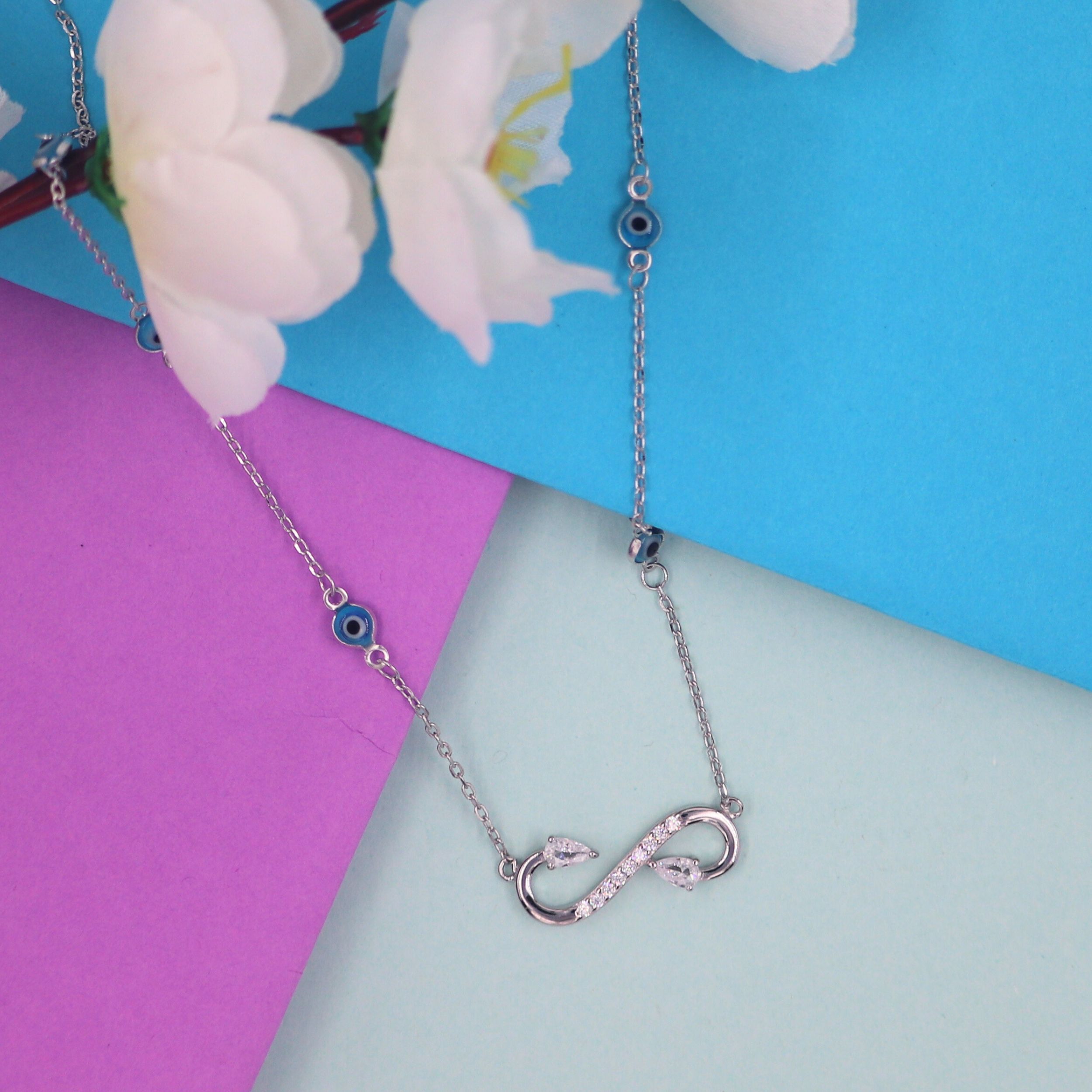 Add a touch of elegance and symbolism to your jewellery collection with this exquisite Sterling Silver Evil Eye and Infinity necklace. Crafted with genuine 925 hallmarked silver, this necklace features a stunning combination of two meaningful symbols – the protective Evil Eye in vibrant turquoise blue and a graceful infinity symbol adorned with sparkling crystals. The delicate silver chain perfectly complements these meaningful elements, creating a versatile piece that works beautifully for both everyday wear and special occasions. This thoughtfully designed necklace makes for a meaningful gift choice, perfect for expressing care and endless affection to someone special. Each piece comes with a Certificate of Authenticity, confirming its premium silver quality. The necklace seamlessly combines traditional symbolism with contemporary design, making it a cherished addition to any jewellery collection.