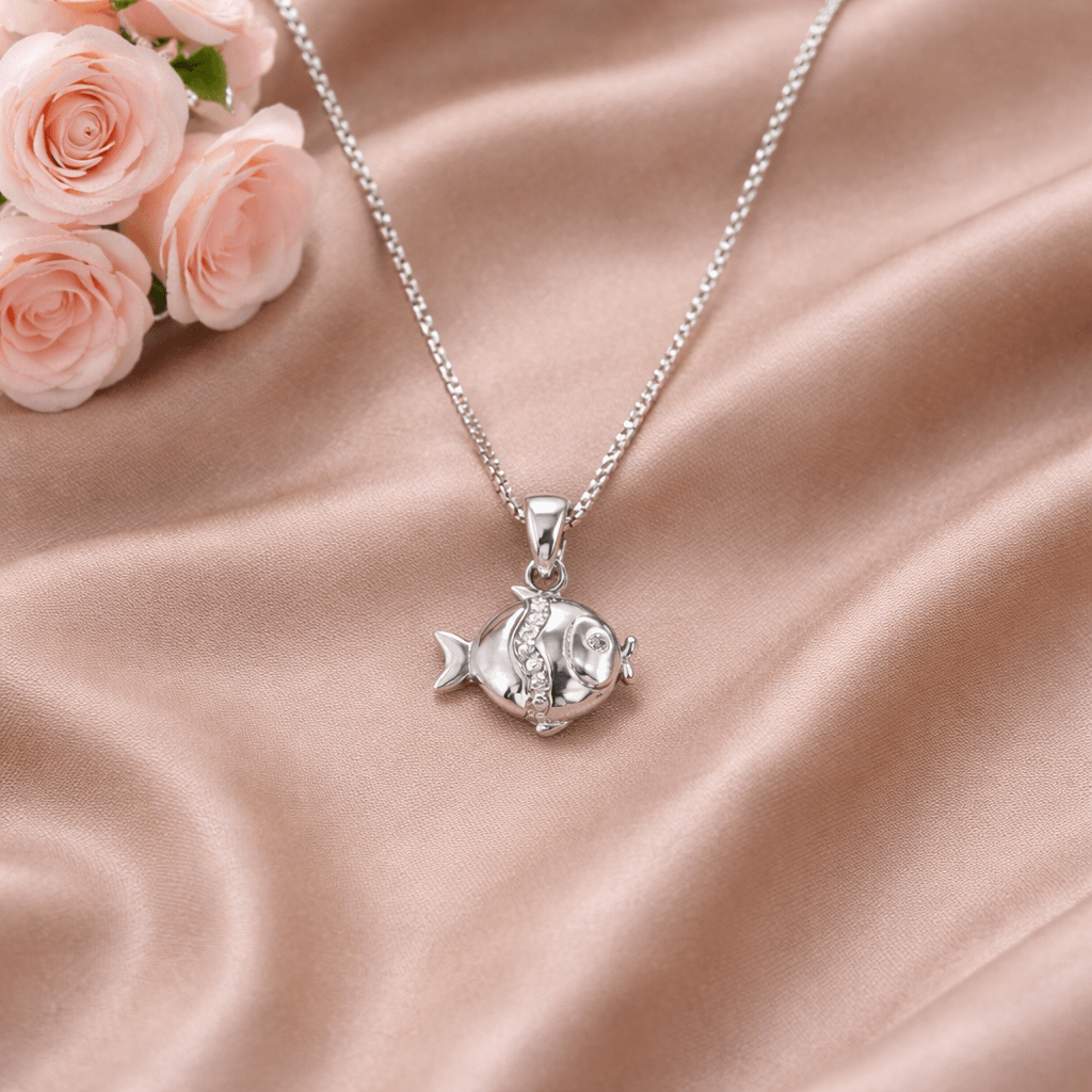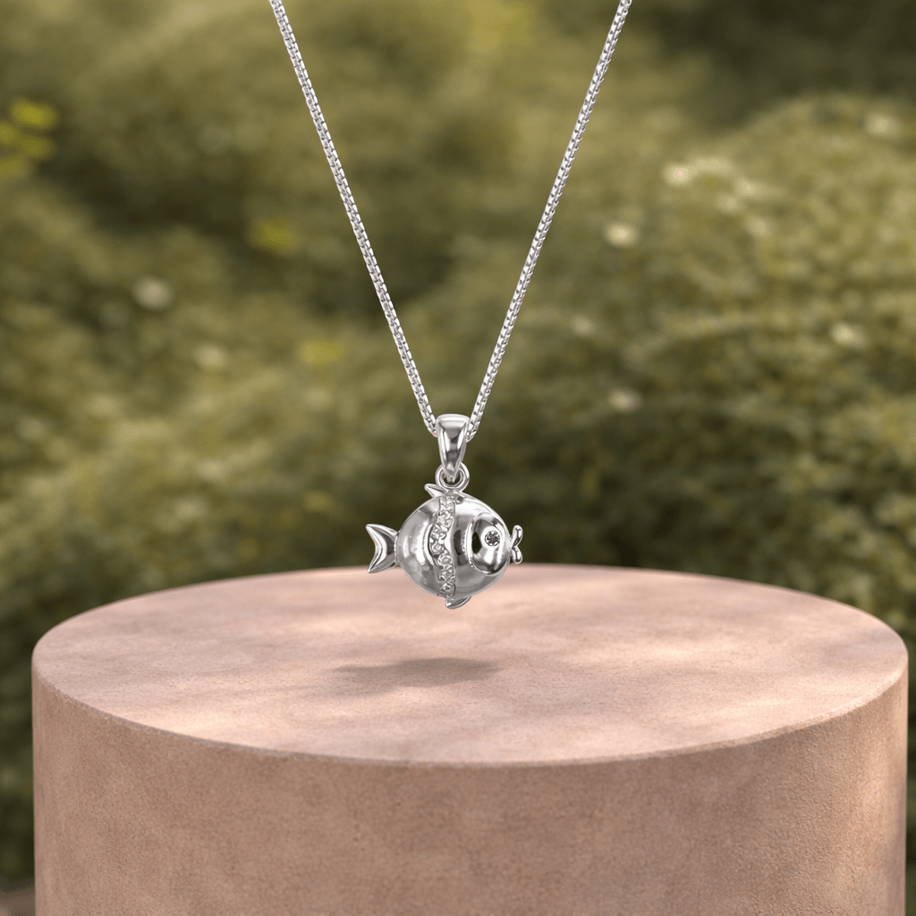 Fish Pendant 925 Silver Necklace by Arika JewellersMake a splash with this charming Fish Pendant 925 Silver Necklace by Arika Jewellers, crafted from pure 92.5 sterling silver with a sleek box chain. The playful design features a fish-shaped pendant adorned with a sparkling line of cubic zirconia stones, creating a beautiful wave-like effect. Additionally, the glossy finish enhances its elegant yet fun appeal. As a result, this necklace becomes a perfect blend of quirky style and refined beauty.