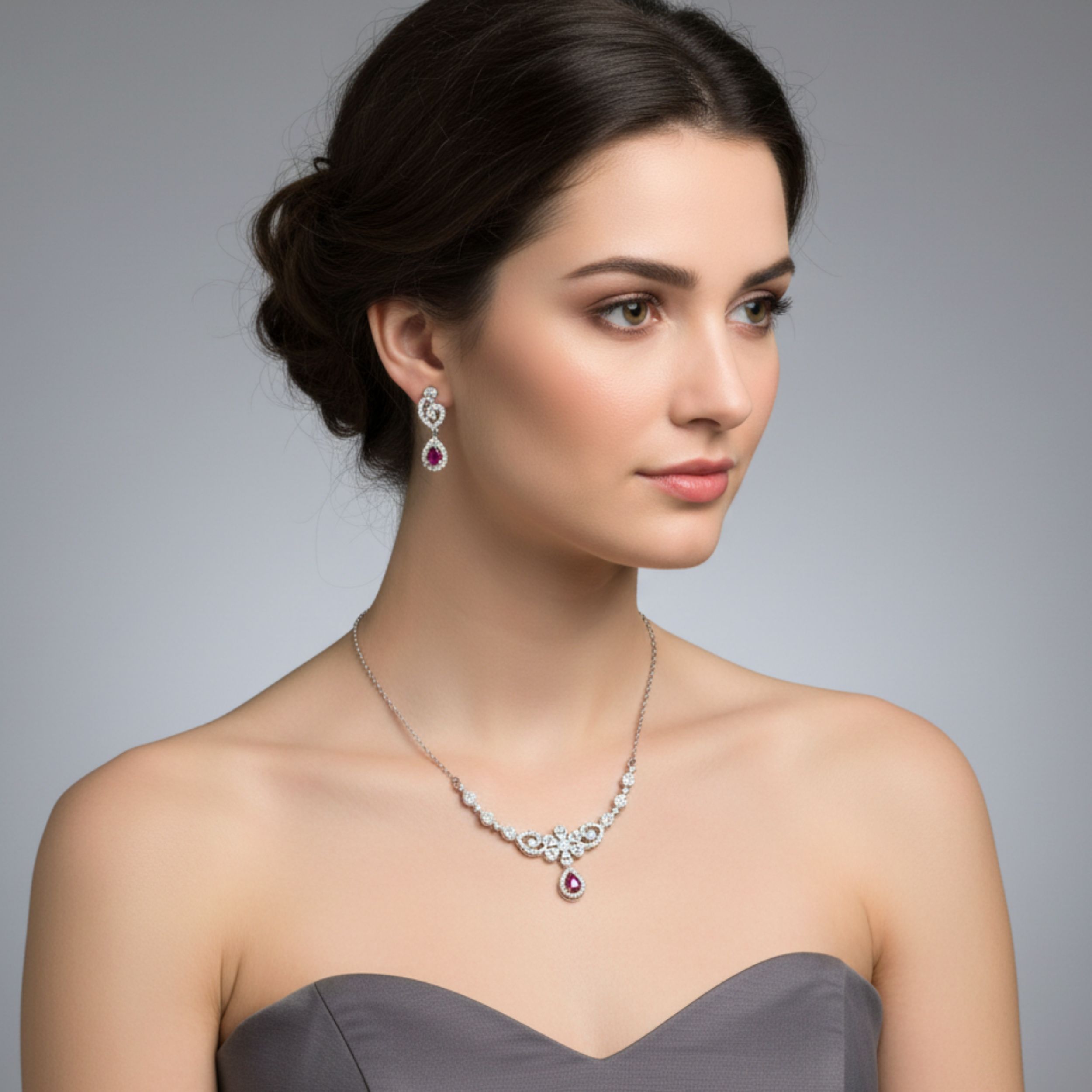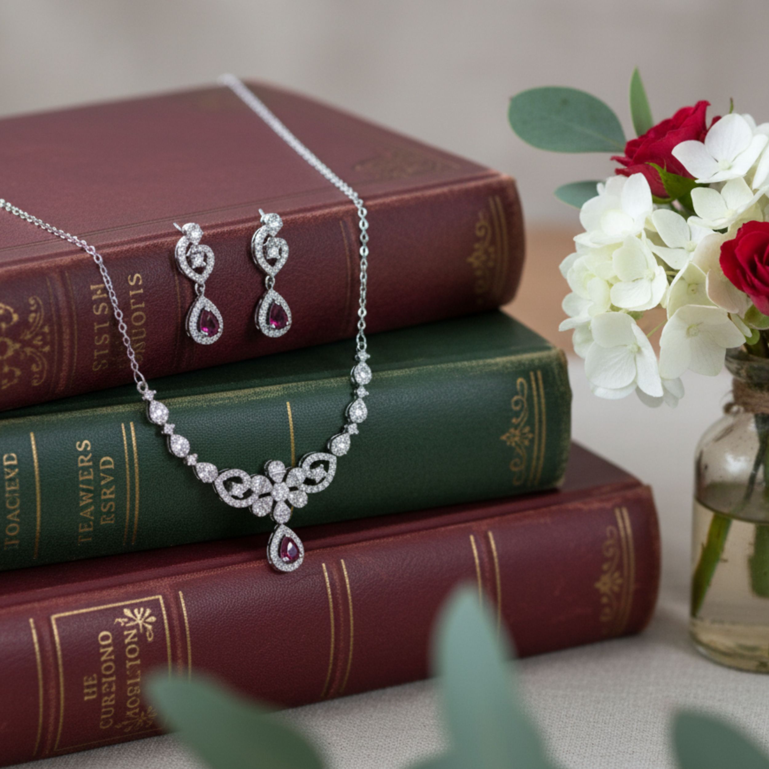 Elevate your special occasions with this exquisite silver jewellery set featuring stunning ruby drops. The set includes a beautifully crafted necklace and matching earrings, showcasing an intricate floral design that combines brilliant cubic zirconia stones with deep red ruby drops. The necklace features a graceful arrangement of floral motifs, culminating in a striking ruby pendant, while the coordinating earrings echo the same elegant design. Crafted in genuine 925 sterling silver, each piece demonstrates superior craftsmanship with attention to detail. The set arrives with a Certificate of Authenticity, confirming its sterling silver purity. Perfect for weddings, festivals, or any formal occasion, this versatile set adds a touch of sophistication to both traditional and contemporary attire. The combination of clear stones and ruby drops creates a mesmerising play of light that draws attention to the wearer. This jewellery set makes for a thoughtful gift choice, particularly suitable for special occasions and celebrations.