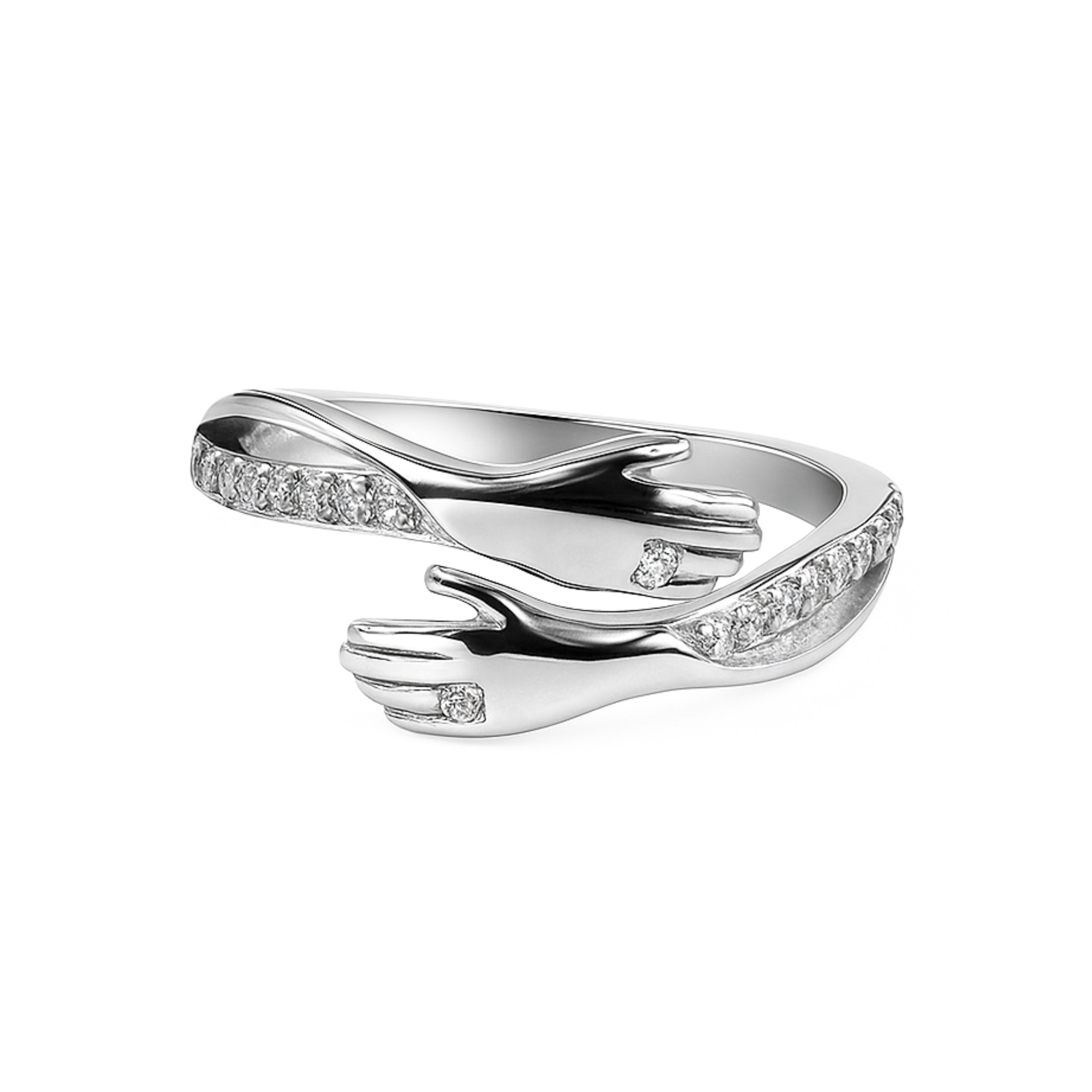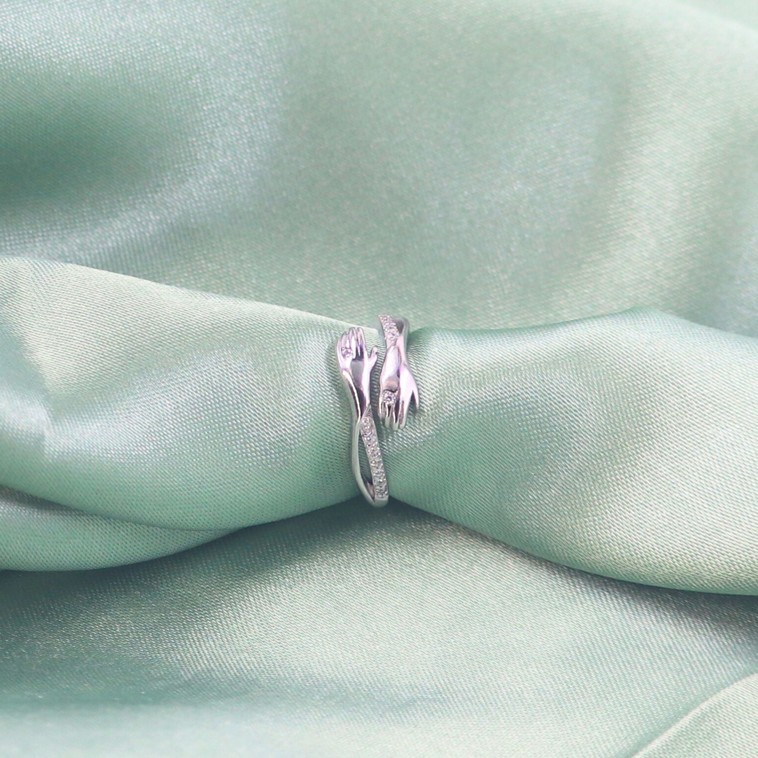 Embrace love, comfort, and togetherness with this elegant Hug Ring, beautifully crafted in 925 sterling silver. Featuring two delicately sculpted hands that wrap around your finger, this unique design symbolizes care, support, and everlasting connection. The sleek silver finish is enhanced with sparkling cubic zirconia accents, adding a touch of brilliance and charm.Whether worn as a daily reminder of self-love or given as a heartfelt gift to someone special, the Hug Ring is a timeless piece that carries deep meaning and emotional warmth.
