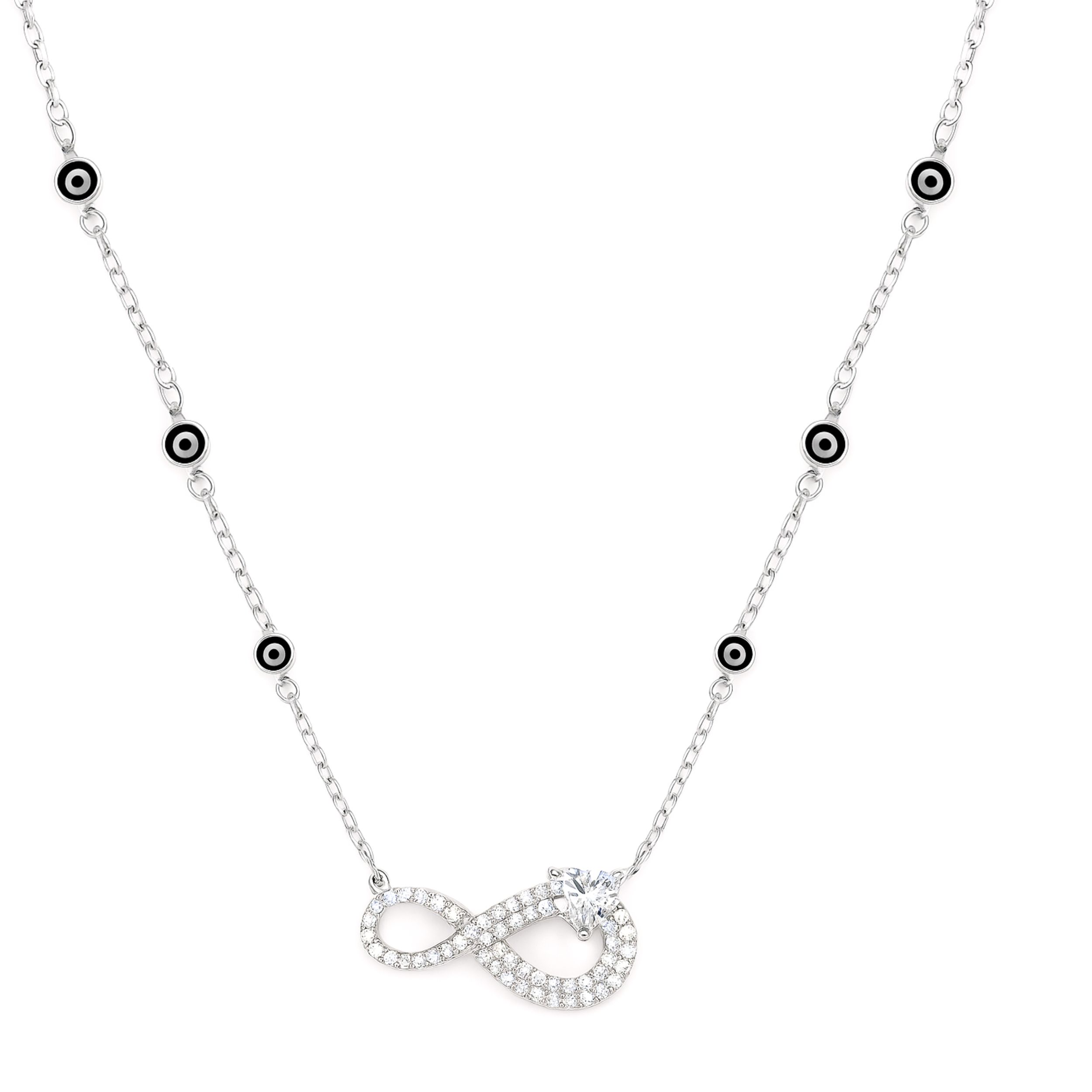 Elevate your style with this exquisite silver infinity pendant necklace, a timeless piece that beautifully combines elegance with symbolic meaning. The necklace features a stunning infinity symbol embellished with sparkling cubic zirconia stones that catch and reflect light brilliantly. The pendant is complemented by a delicate silver chain accented with eye-catching black circular details, creating a unique and sophisticated look. Crafted from genuine 925 sterling silver, this necklace demonstrates superior craftsmanship and attention to detail. The versatile design makes it perfect for both everyday wear and special occasions. This meaningful piece of jewellery serves as an ideal gift choice for women and girls, symbolising endless love and eternal bonds. The necklace comes with a Certificate of Authenticity, confirming its sterling silver quality. Each element of this necklace has been carefully designed to ensure both beauty and durability, making it a cherished addition to any jewellery collection.