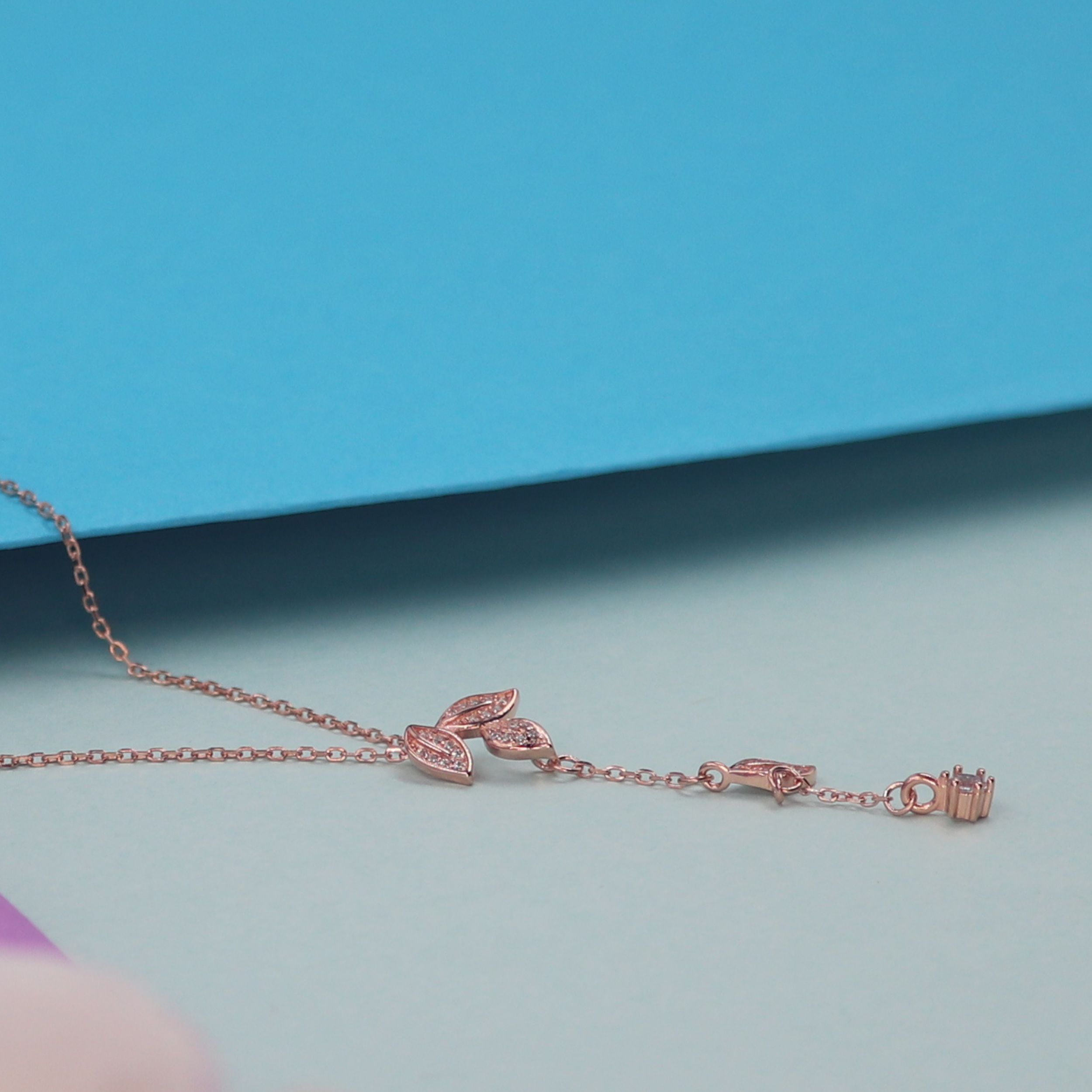 Add a touch of elegance to your jewellery collection with this exquisite rose gold leaf drop necklace. The delicate design features shimmering crystal-studded leaves cascading down in a graceful Y-shaped arrangement, culminating in a dainty floral pendant. Crafted from premium 925 sterling silver with rose gold plating, this necklace strikes the perfect balance between sophistication and whimsy. The fine chain and nature-inspired elements make it versatile enough for both everyday wear and special occasions. An ideal accessory to complement both traditional Indian attire and contemporary western outfits, this necklace makes for a thoughtful gift choice. The adjustable chain ensures a perfect fit, while the high-quality craftsmanship promises lasting beauty. Each piece comes with a certificate of authenticity, confirming its genuine 925 silver composition.