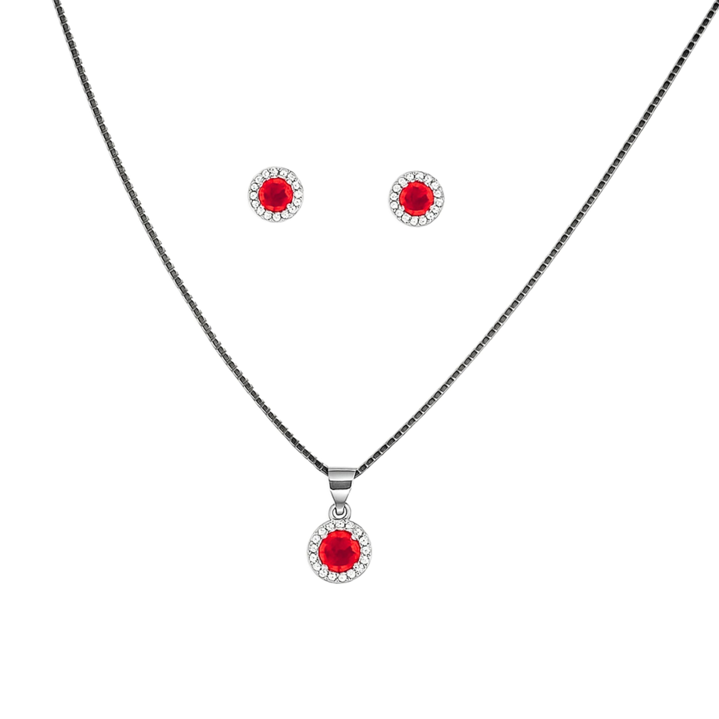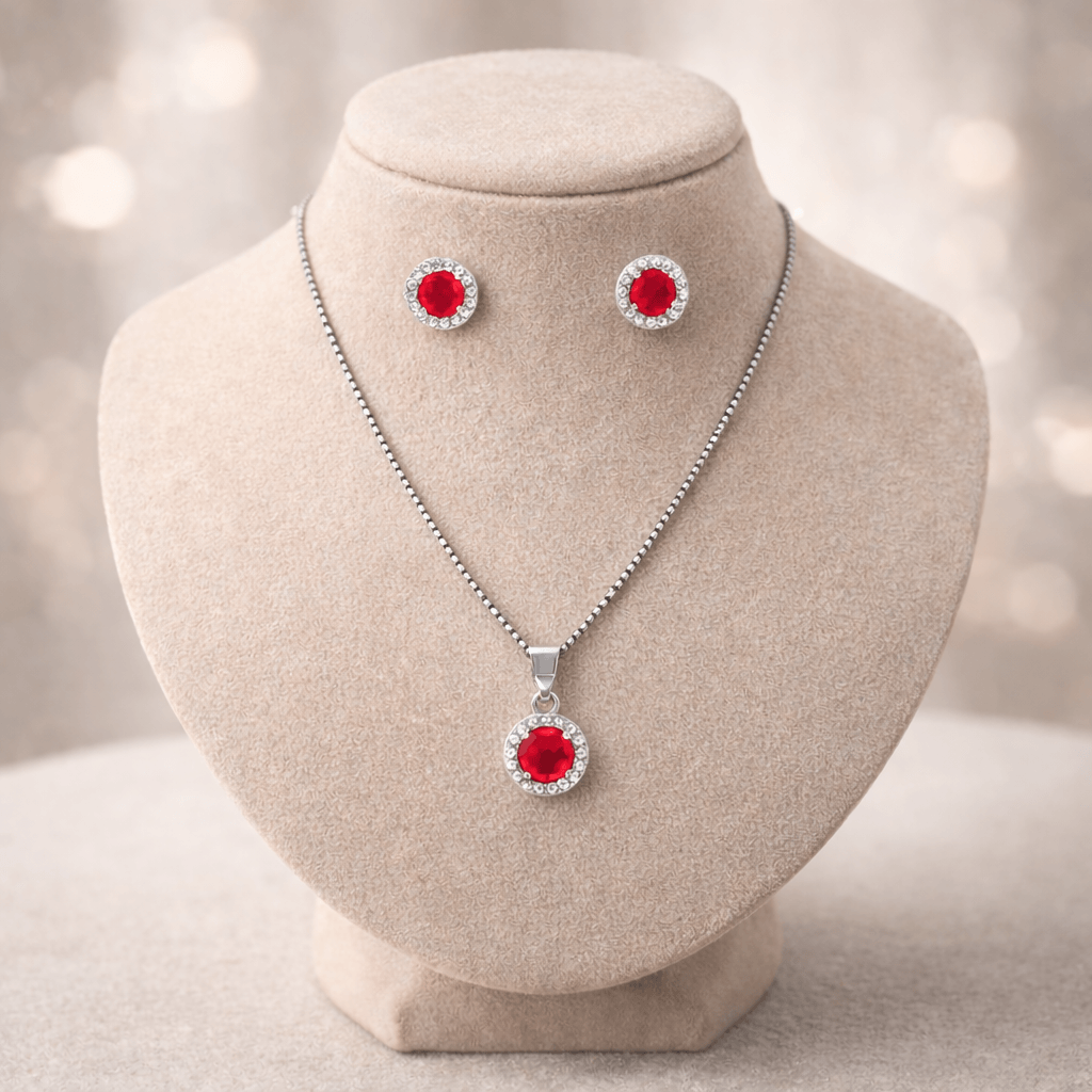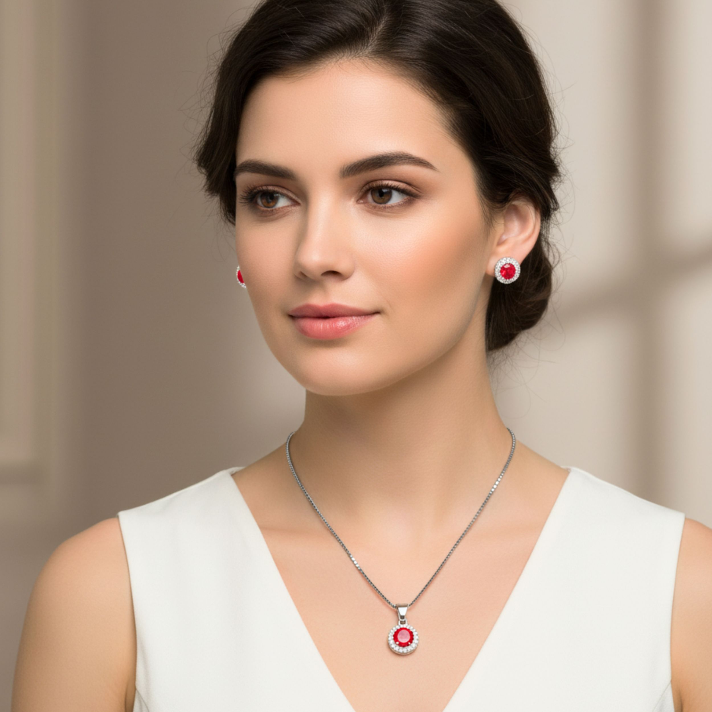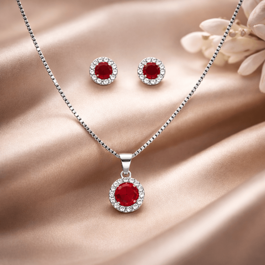 Ruby Crystal Silver Jewellery Set by Arika JewellersElevate your jewellery collection with the Ruby Crystal Silver Jewellery Set by Arika Jewellers, a stunning blend of elegance, sparkle, and timeless design. This beautifully crafted set features a round ruby crystal centerpiece surrounded by a halo of shimmering stones that enhance its brilliance. Additionally, the vibrant ruby tone adds a rich and luxurious appeal. As a result, this design stands out beautifully for both traditional and modern styling. Why Choose This Ruby Crystal Silver Jewellery Set?The set includes matching stud earrings and a pendant necklace, creating a perfectly coordinated look that adds sophistication to any outfit. Therefore, it becomes an ideal choice for effortless styling. Moreover, crafted from high-quality 925 sterling silver, this piece offers durability along with a long-lasting shine. The delicate silver box chain complements the pendant beautifully, giving it a refined and modern finish. Perfect for Every OccasionWhether you are dressing up for a special occasion, attending a celebration, or looking for a thoughtful gift, this jewellery set adds a touch of glamour and charm. Furthermore, its lightweight and comfortable design makes it suitable for extended wear.