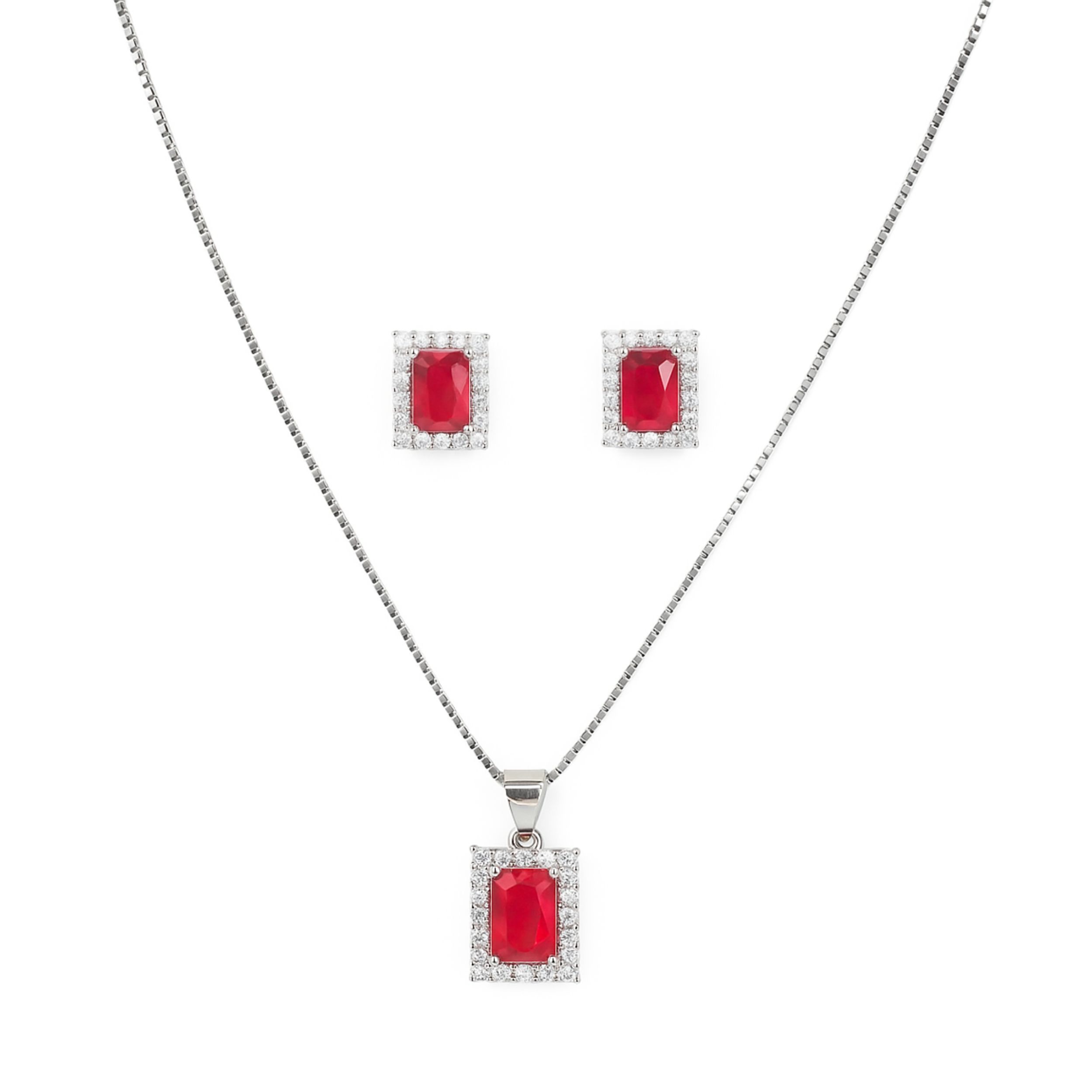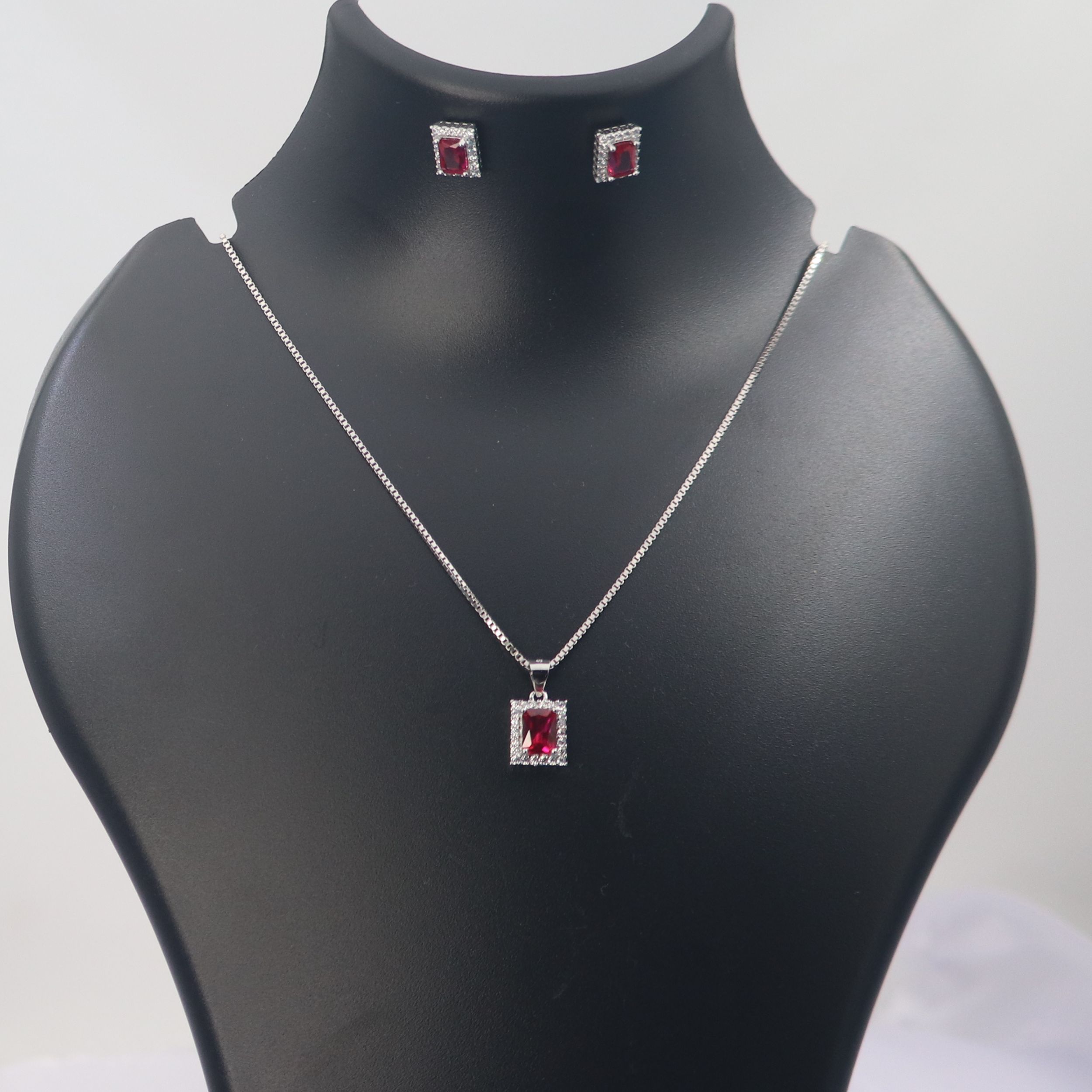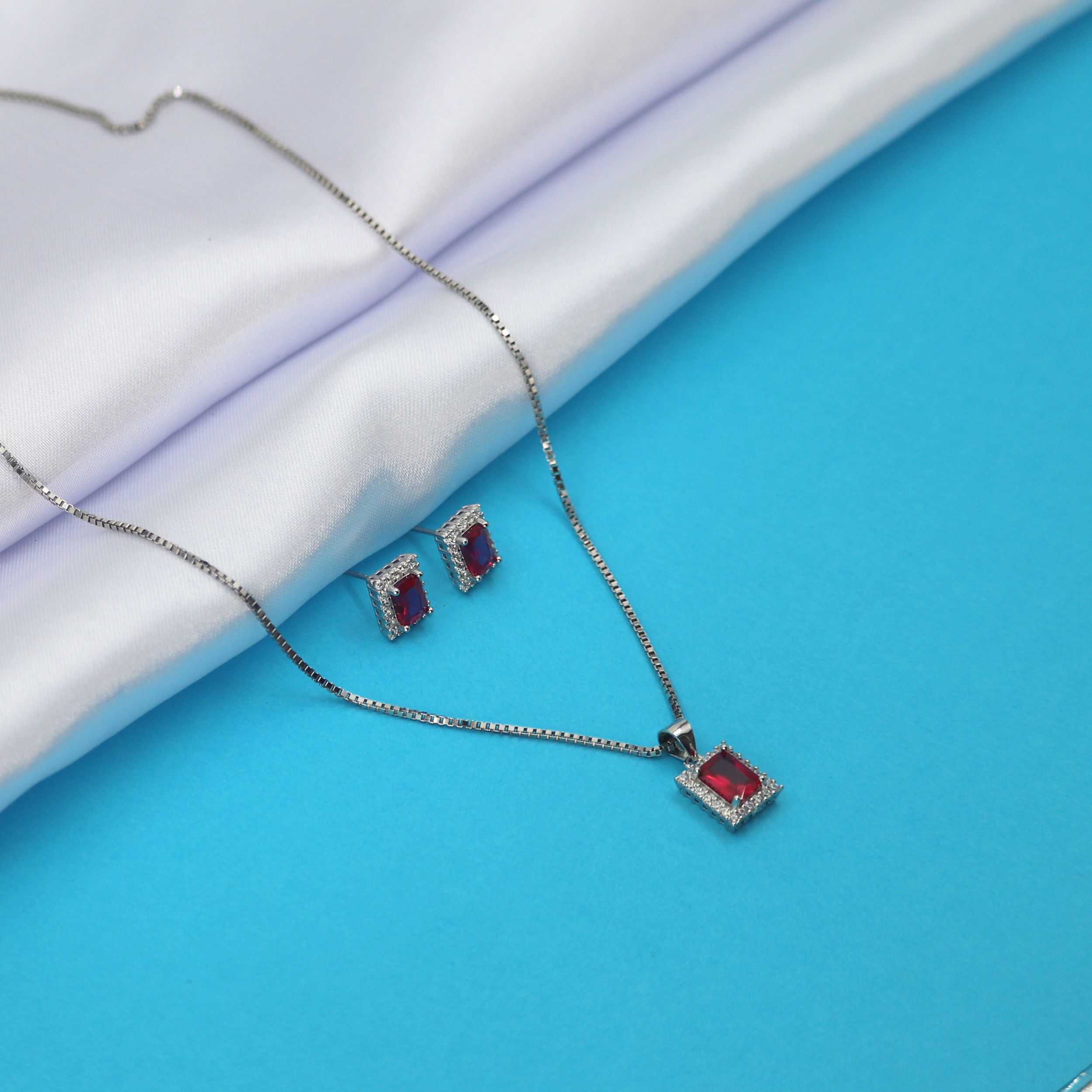Make a stunning style statement with this exquisite jewellery set featuring a pendant necklace and matching stud earrings. Crafted in premium 925 sterling silver, this set showcases magnificent ruby red crystals as centrepieces, each elegantly framed by sparkling clear crystals in a sophisticated rectangular design. The pendant hangs gracefully from a delicate silver chain that adds a touch of refinement to any outfit. The coordinating stud earrings mirror the pendant’s elegant design, creating a perfectly harmonious look. This versatile set transitions effortlessly from day to evening wear, making it ideal for both special occasions and everyday elegance. The rich ruby red hue combined with the brilliant crystal accents creates a luxurious aesthetic that draws attention while maintaining sophistication. Perfect as a thoughtful gift for someone special or as a precious addition to your personal collection, this jewellery set arrives ready to impress in a beautiful presentation box.