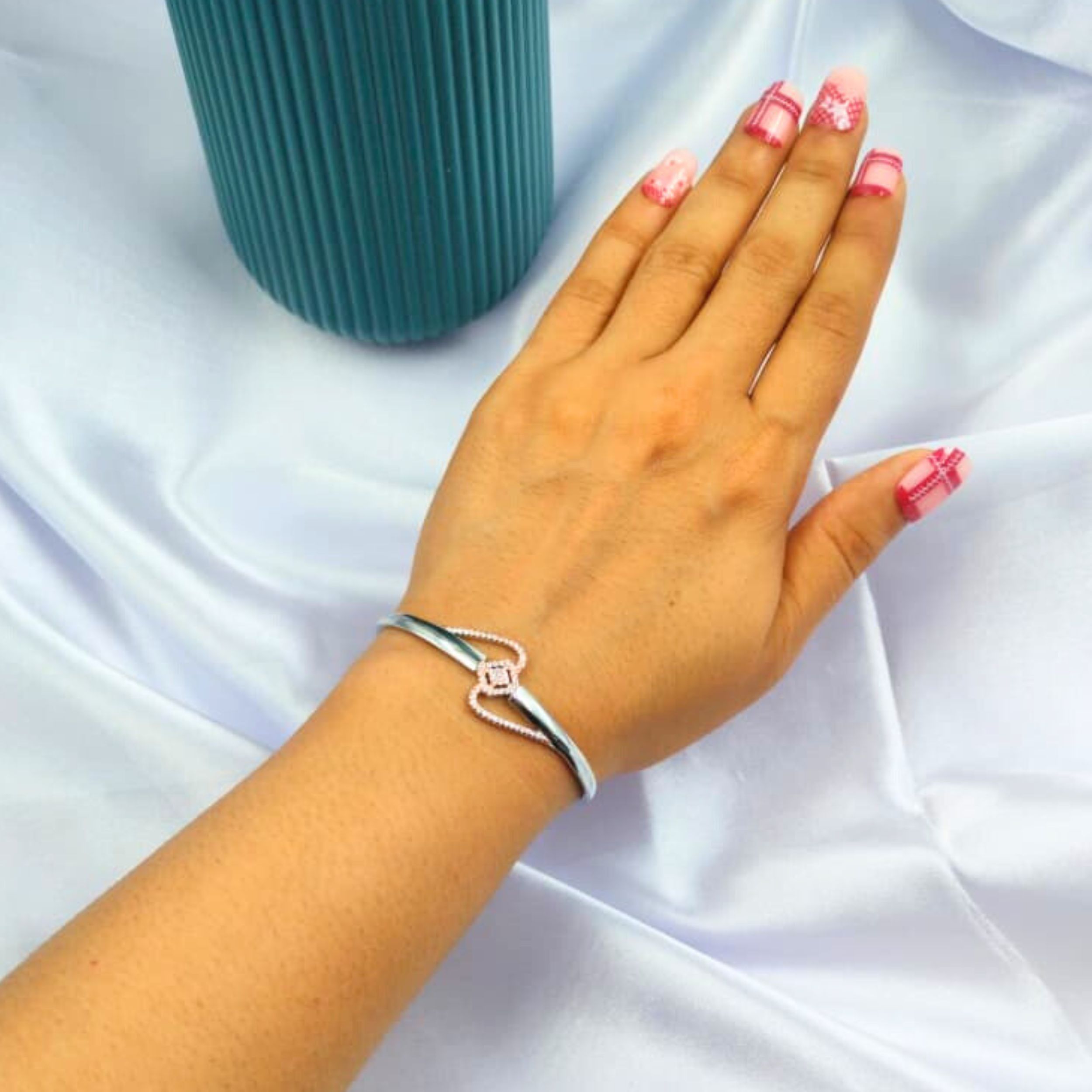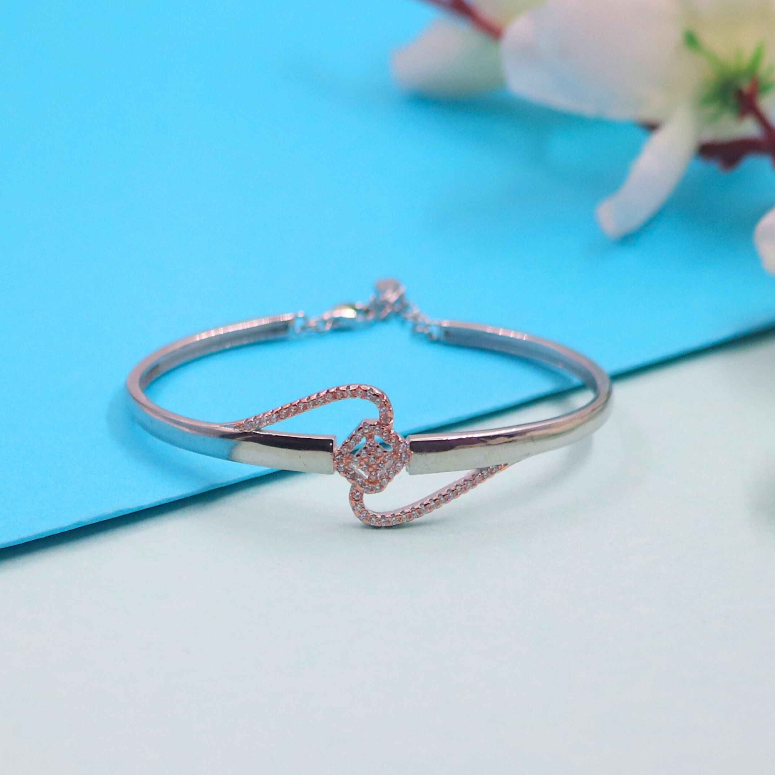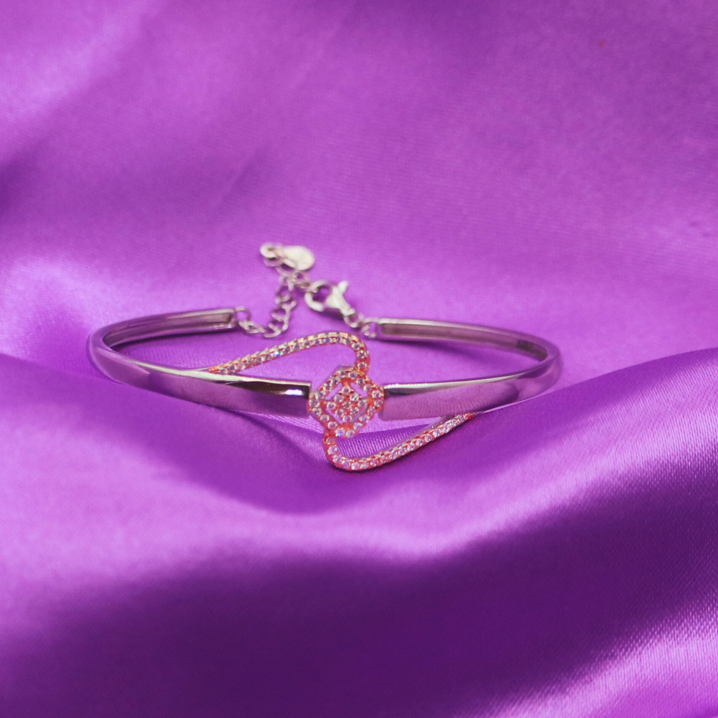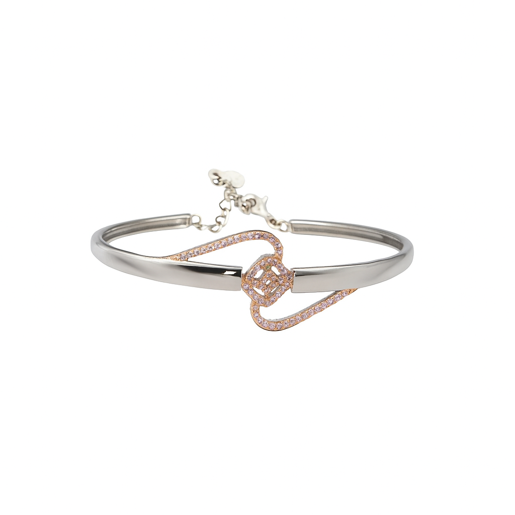 Elevate your accessory collection with this exquisite two-tone bangle bracelet that harmoniously combines rose gold and silver finishes. The bracelet features a sophisticated circular centre design adorned with sparkling stones, creating an eye-catching focal point. The delicate band is embellished with a row of brilliant stones that add a touch of glamour to this versatile piece. Crafted with attention to detail, this bracelet includes an adjustable chain closure for a secure and comfortable fit. The elegant design makes it perfect for both everyday wear and special occasions. This stunning piece comes with a 925 stamp, affirming its quality craftsmanship. Whether worn alone or stacked with other bracelets, this beautiful accessory will add a touch of sophistication to any outfit. It makes for a thoughtful gift choice that will be treasured by someone special in your life.