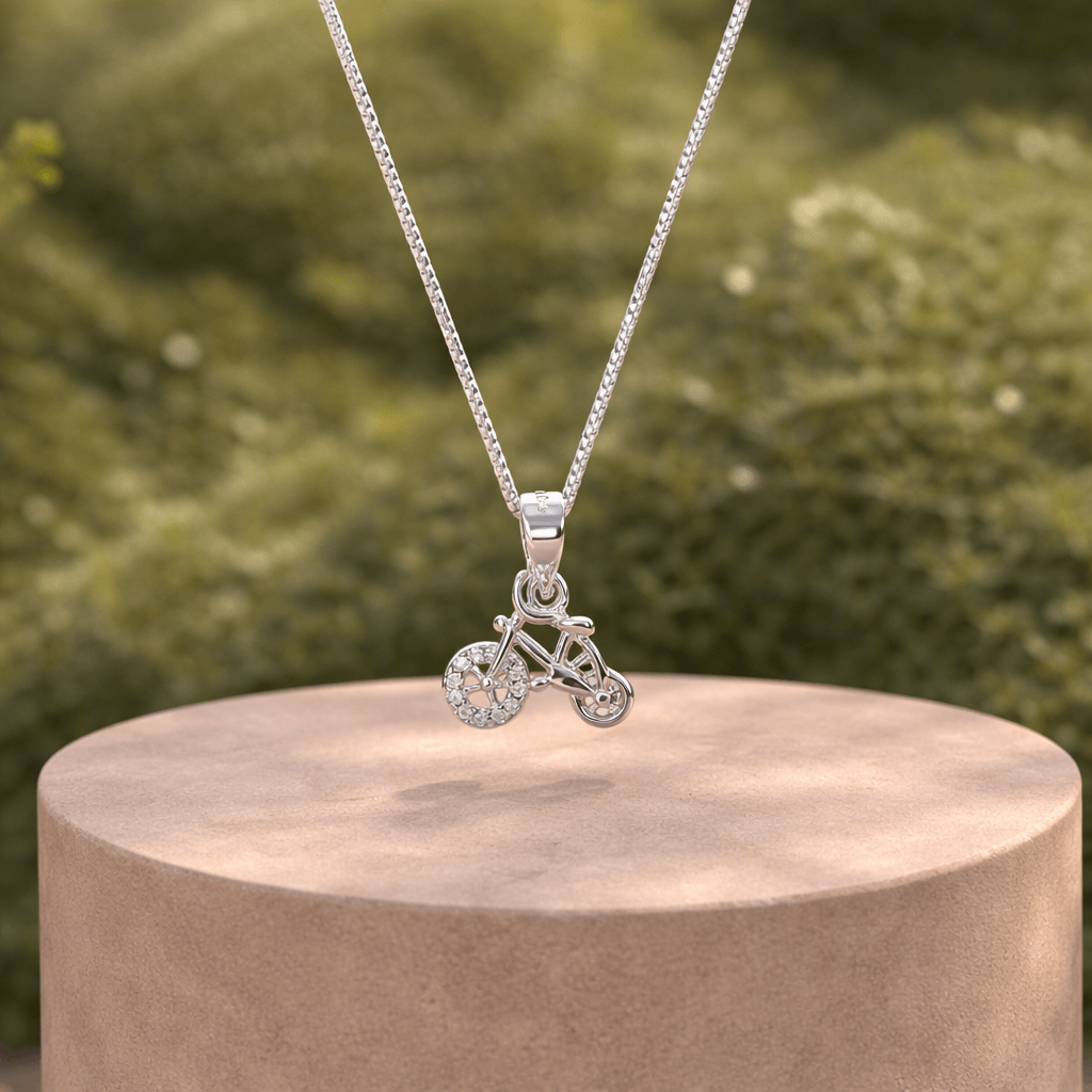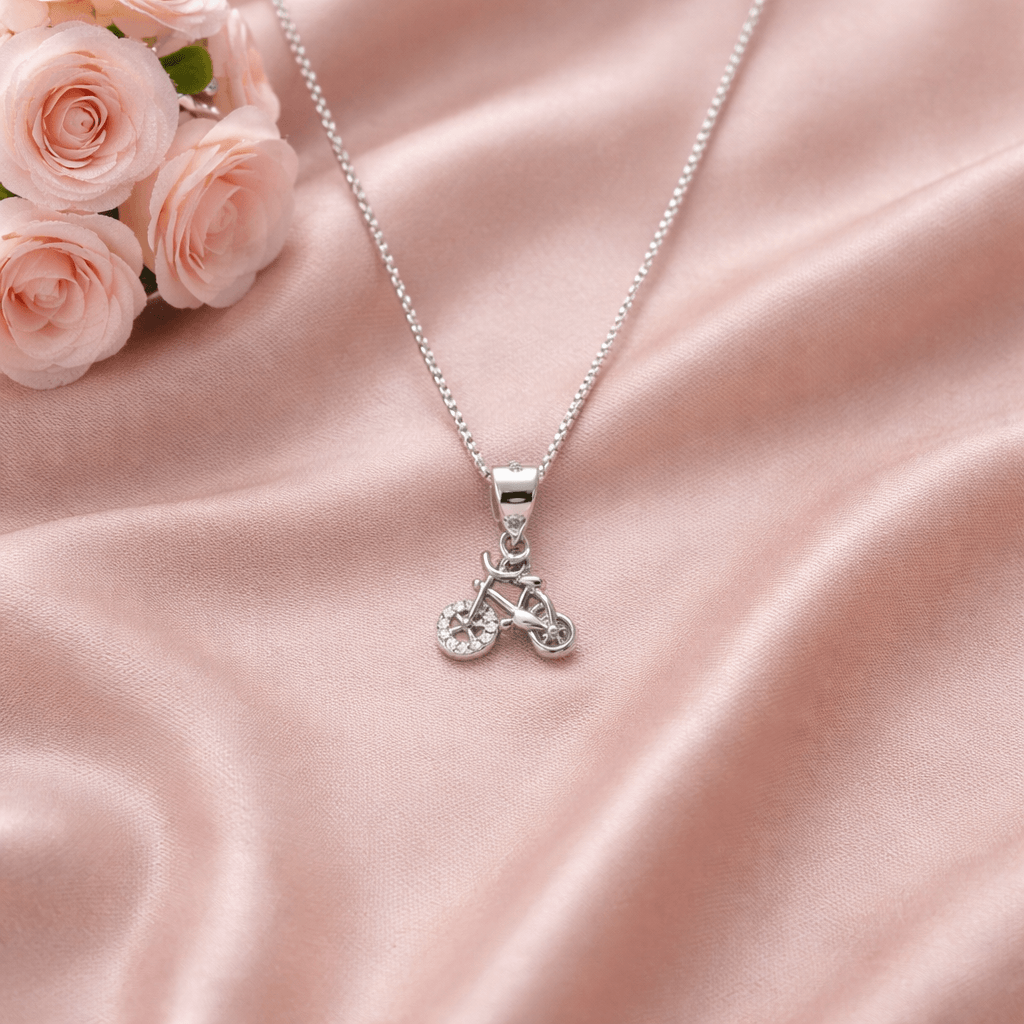 Bicycle Pendant 925 Silver Necklace by Arika JewellersCelebrate your free-spirited soul with this charming Bicycle Pendant 925 Silver Necklace by Arika Jewellers, crafted in pure 92.5 sterling silver. The playful design features a detailed bicycle motif, with one wheel embellished in sparkling cubic zirconia stones that add a subtle shine and sense of motion. Additionally, the unique design brings a youthful and lively touch. As a result, this necklace becomes a perfect blend of fun, symbolism, and everyday elegance.