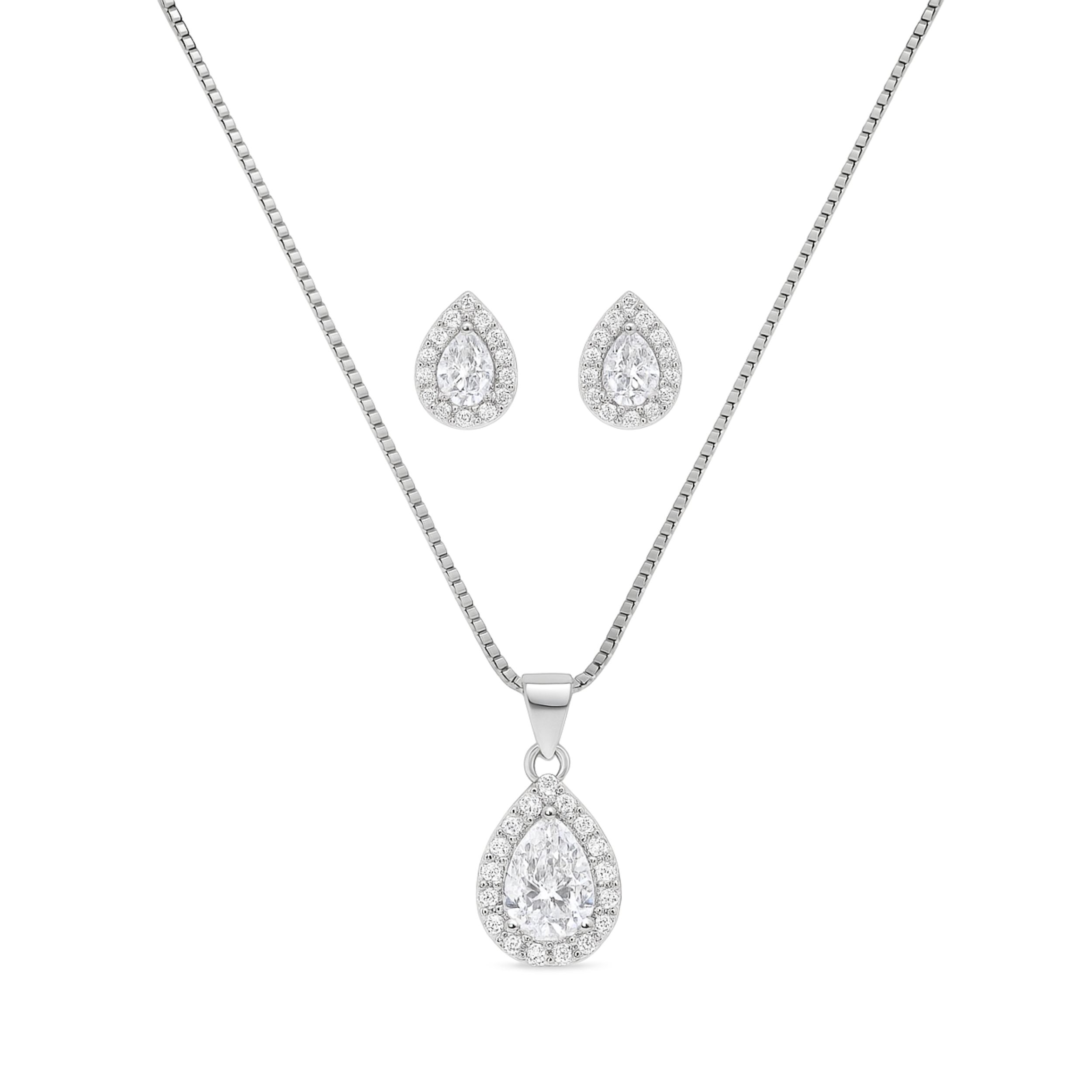 The teardrop-shaped crystals are beautifully accentuated by a delicate halo of smaller stones, creating a mesmerising sparkle from every angle. Moreover, the necklace comes with a sleek box chain that sits gracefully on the neckline, while the matching stud earrings complete the look perfectly.