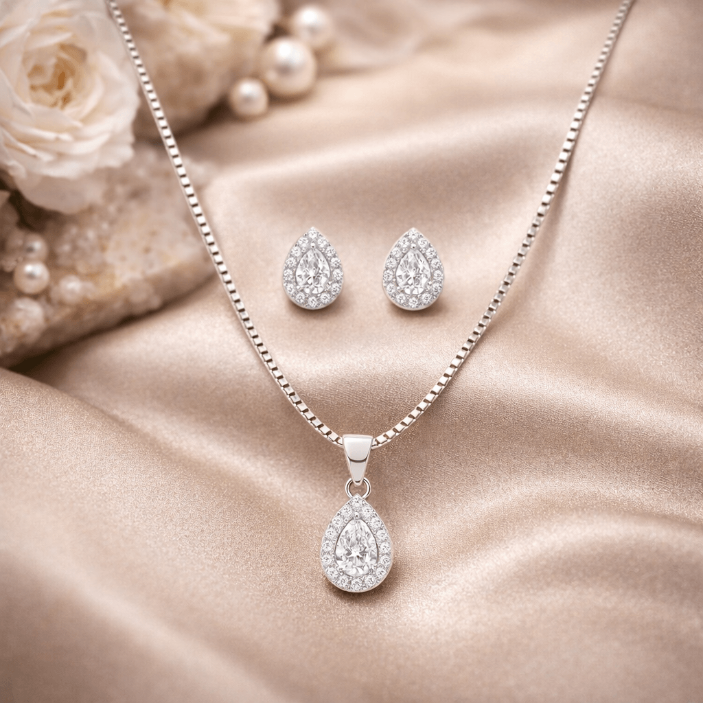 Elevate your jewellery collection with this exquisite Teardrop Crystal 925 Silver Jewellery Set by Arika Jewellers, designed to combine timeless elegance with contemporary style. The set features a stunning teardrop crystal pendant necklace paired with matching stud earrings, all crafted in premium 925 sterling silver.